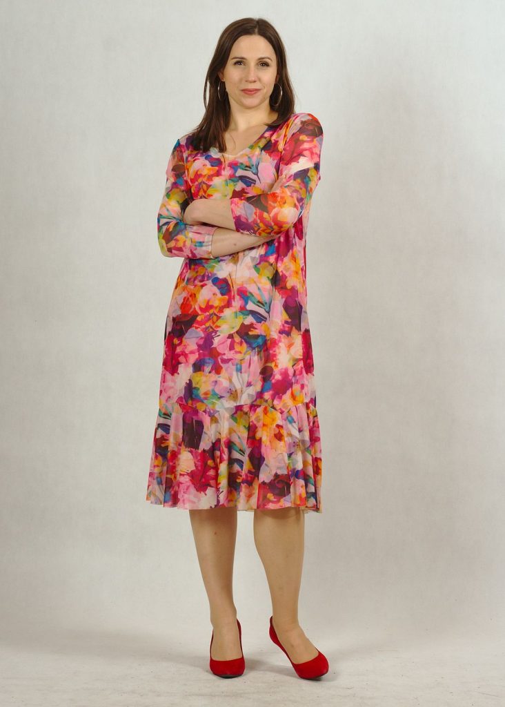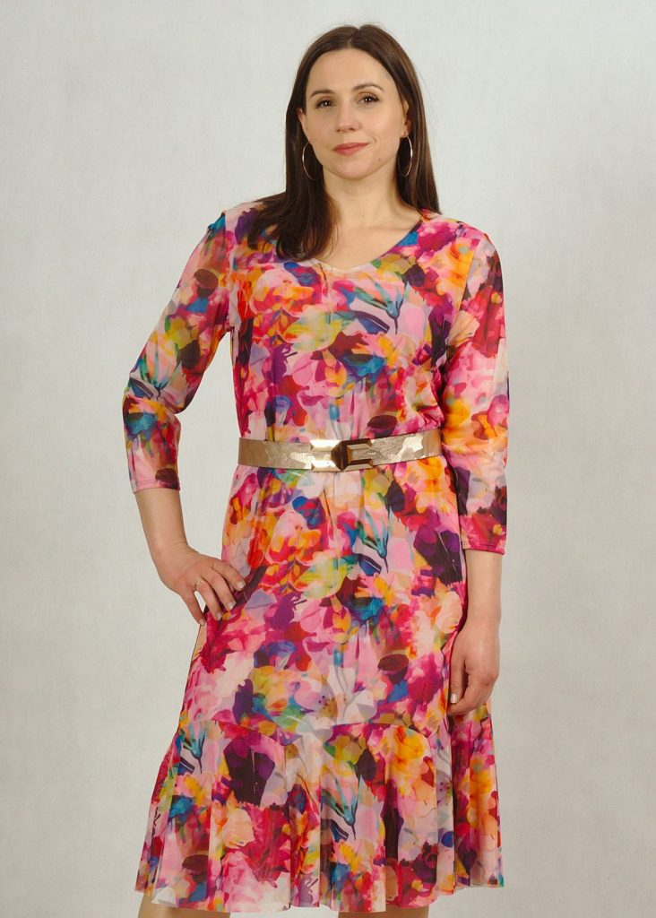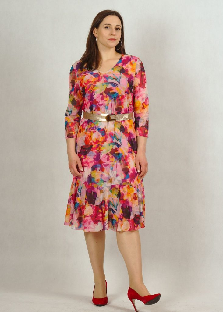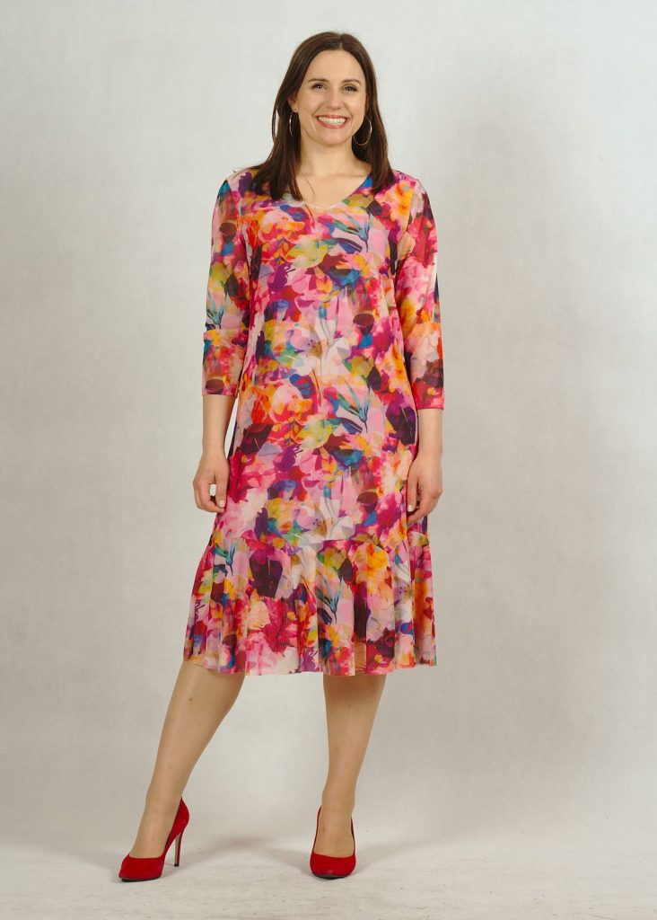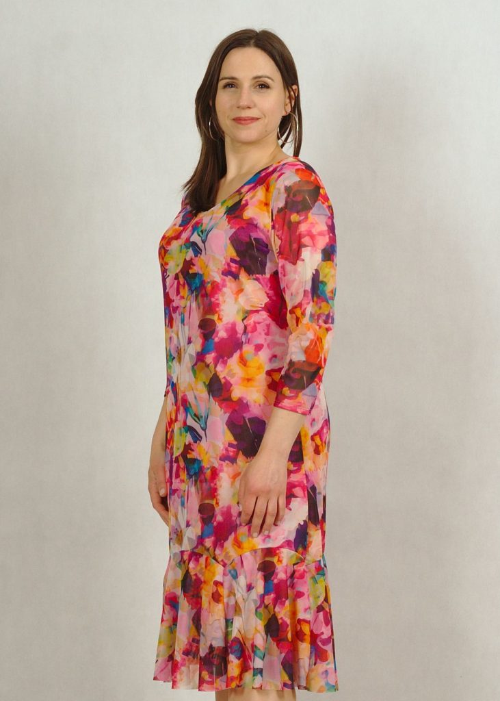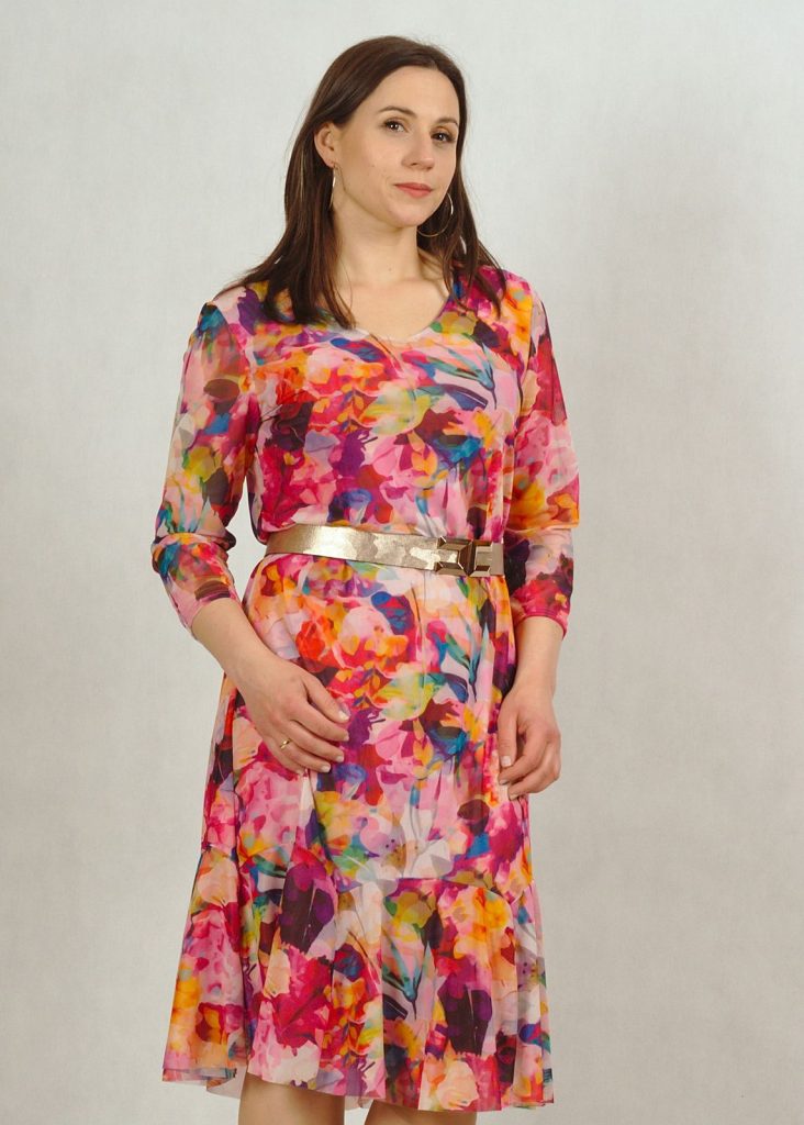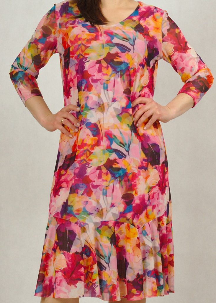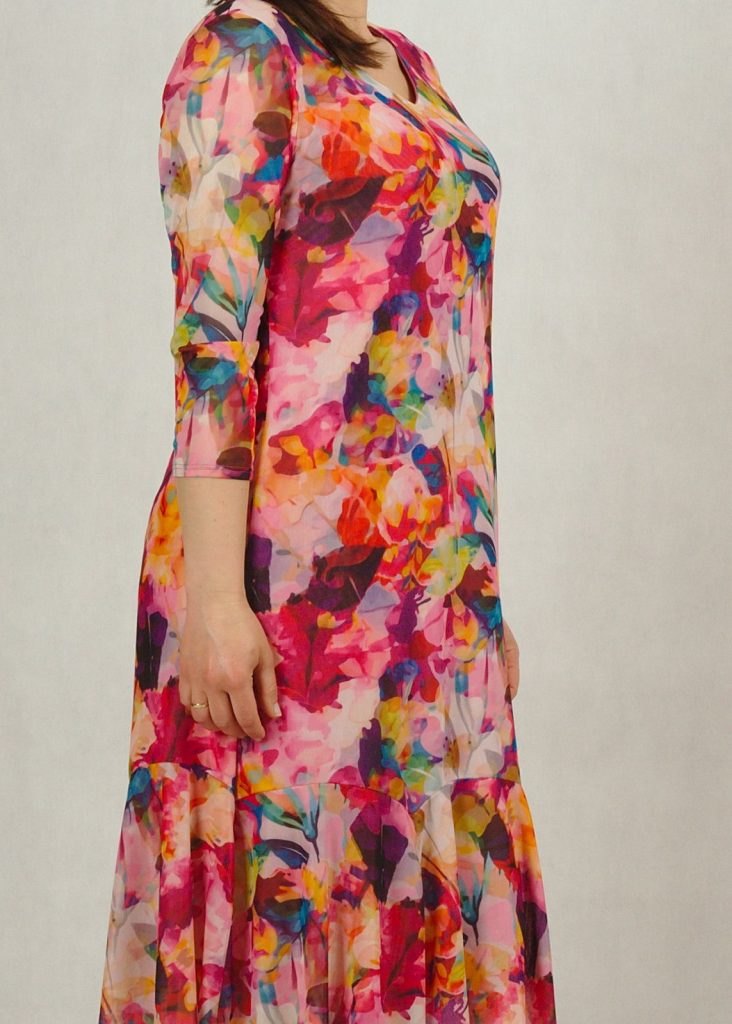 Sukienka premium wykonana jest z dwóch części: wiskozowej, wysokiej jakości podszewki (100%wiskoza) w kolorze pudrowego różu i bardzo eleganckiej tkaniny z siatki, wykończonej zmysłową falbanką na dole. Dekolt w serek optycznie wyszczupli sylwetkę, rękaw za łokieć przykryje subtelnie ramiona. W tym miejscu siatka jest przezroczysta.