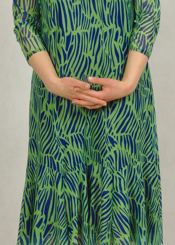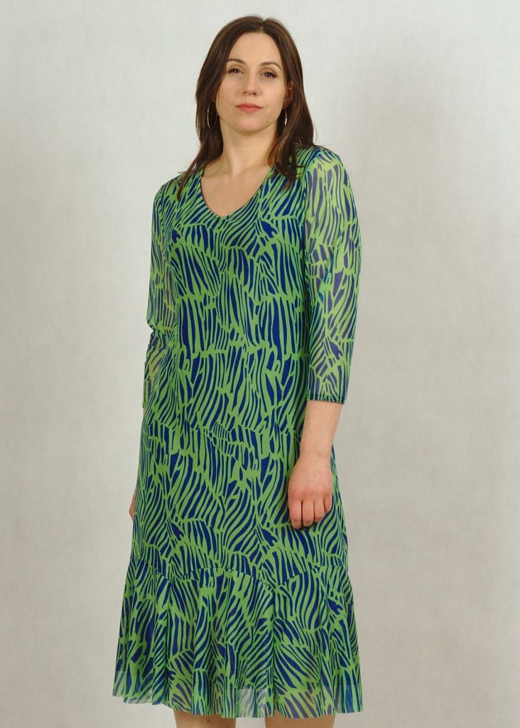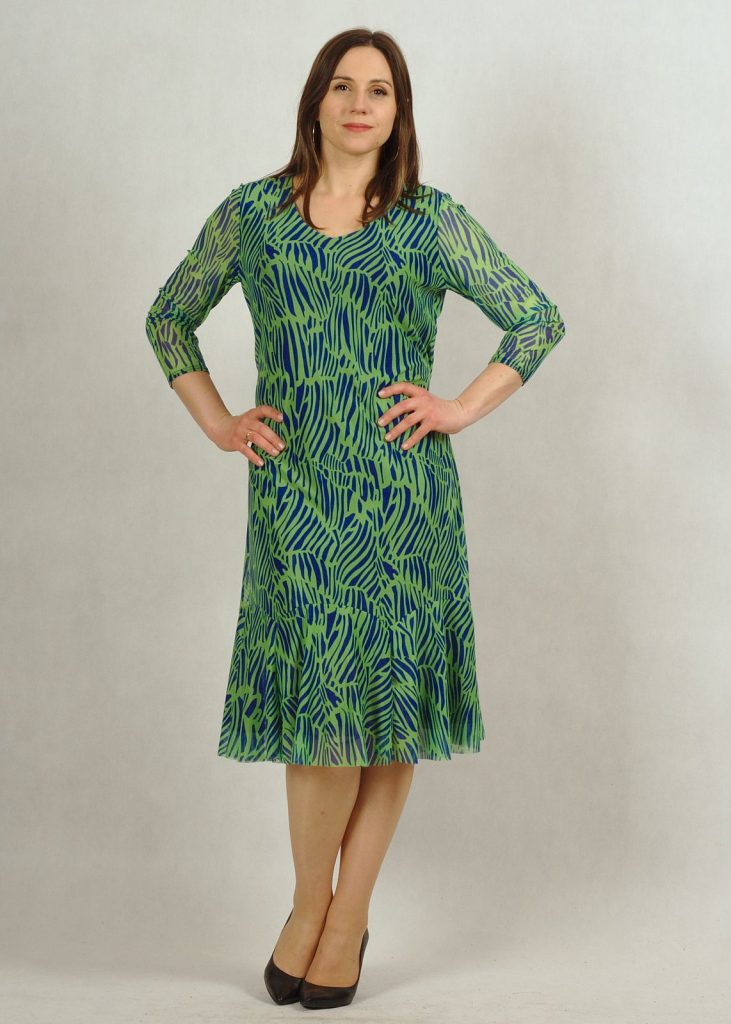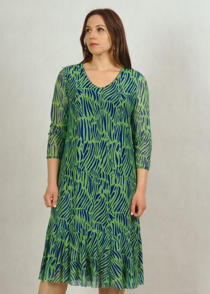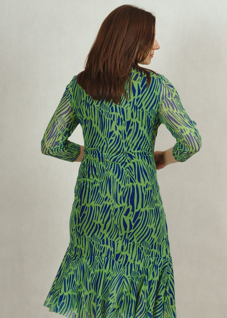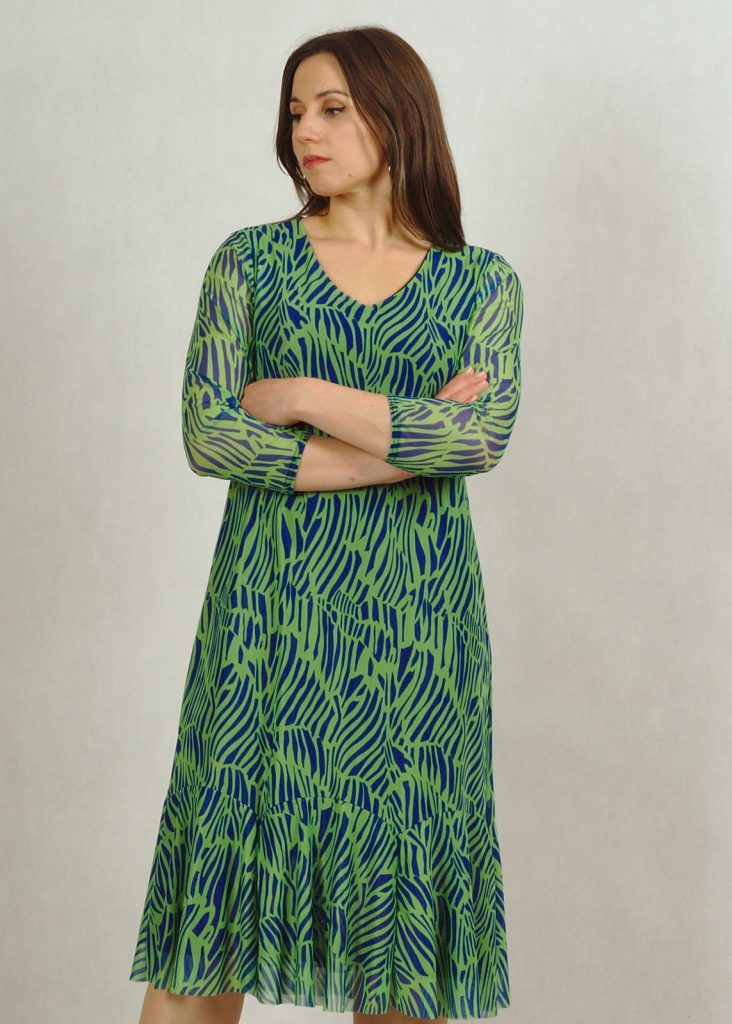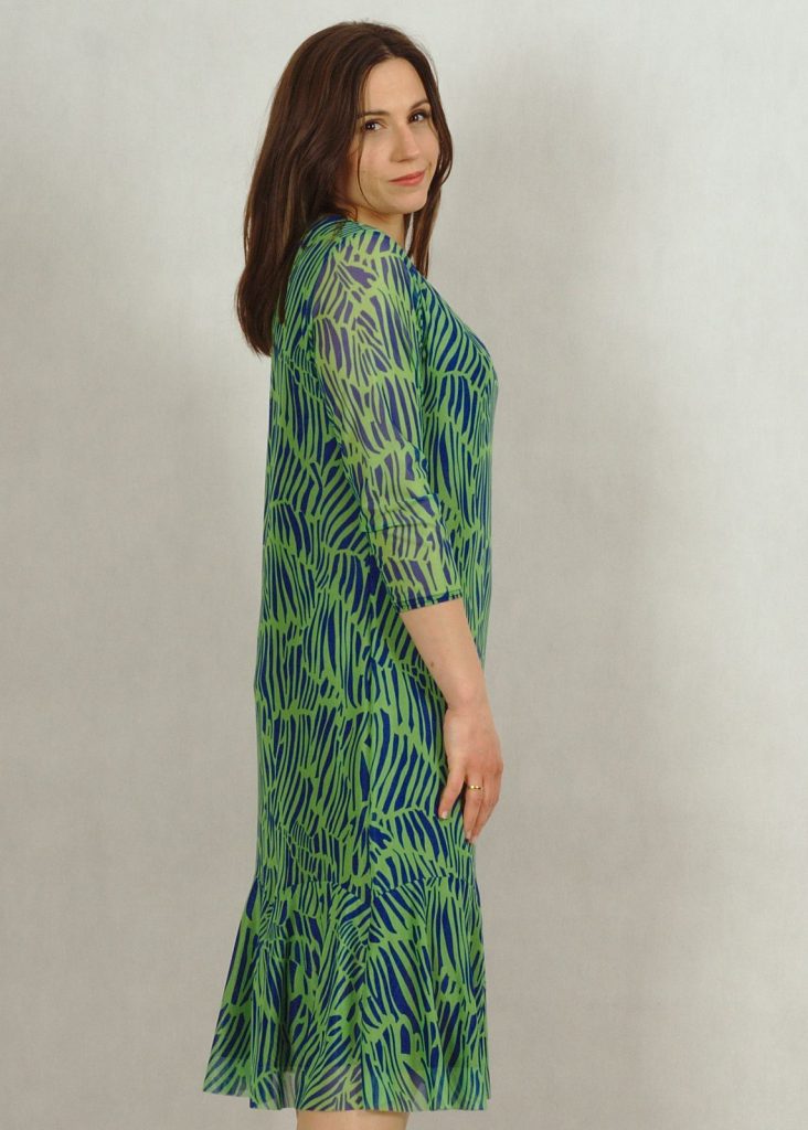 Sukienka premium wykonana jest z dwóch części: wiskozowej, wysokiej jakości podszewki (100%wiskoza) w kolorze granatowym i bardzo eleganckiej tkaniny z siatki, wykończonej zmysłową falbanką na dole. Dekolt w serek optycznie wyszczupli sylwetkę, rękaw za łokieć przykryje subtelnie ramiona. W tym miejscu siatka jest przezroczysta.