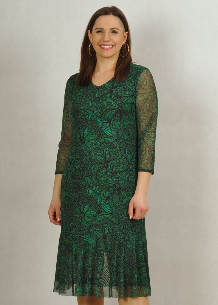 Sukienka premium wykonana jest z dwóch części: wiskozowej, wysokiej jakości podszewki w kolorze czarnym i bardzo eleganckiej tkaniny z siatki, wykończonej zmysłową falbanką na dole. Dekolt w serek opytcznie wyszczupli sylwetkę, rękaw za łokieć przykryje subtelnie ramiona. W tym miejscu siatka jest przezroczysta.