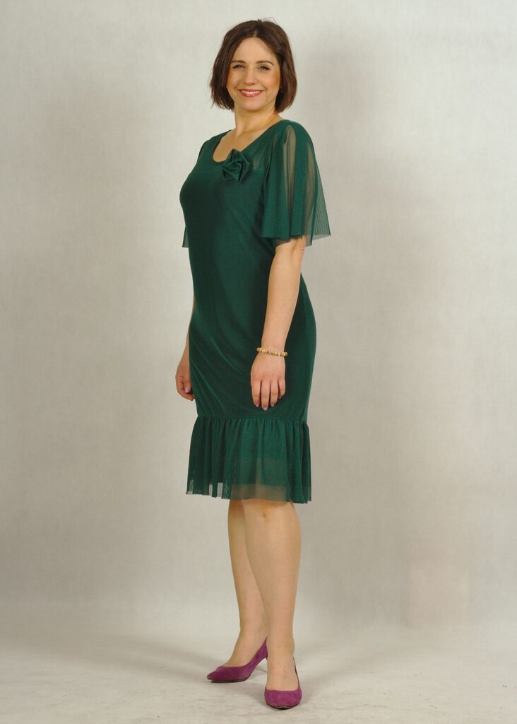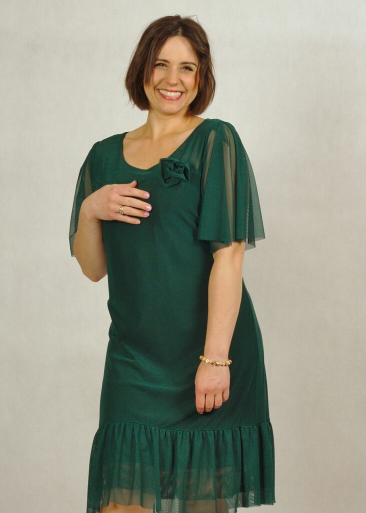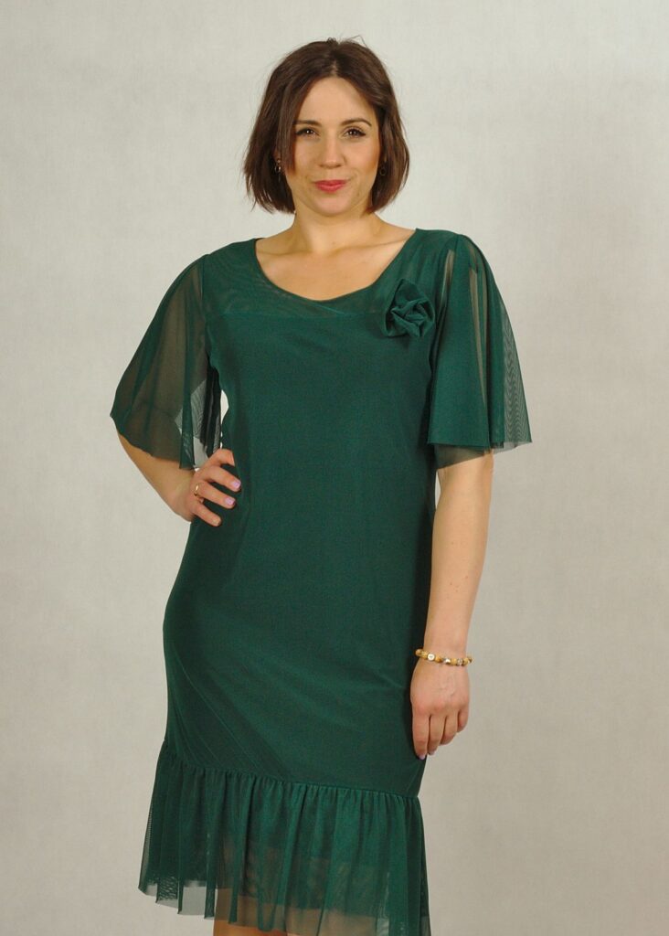 Długość sukienki delikatnie za kolano, dół wykończony zgrabną falbanką.