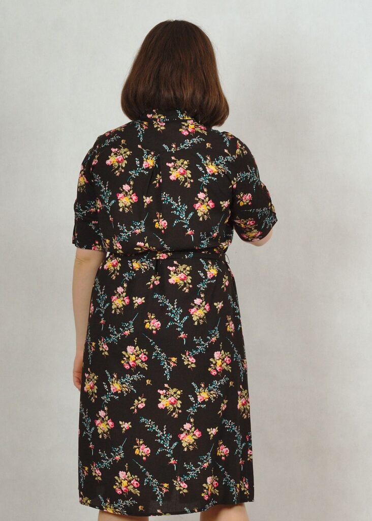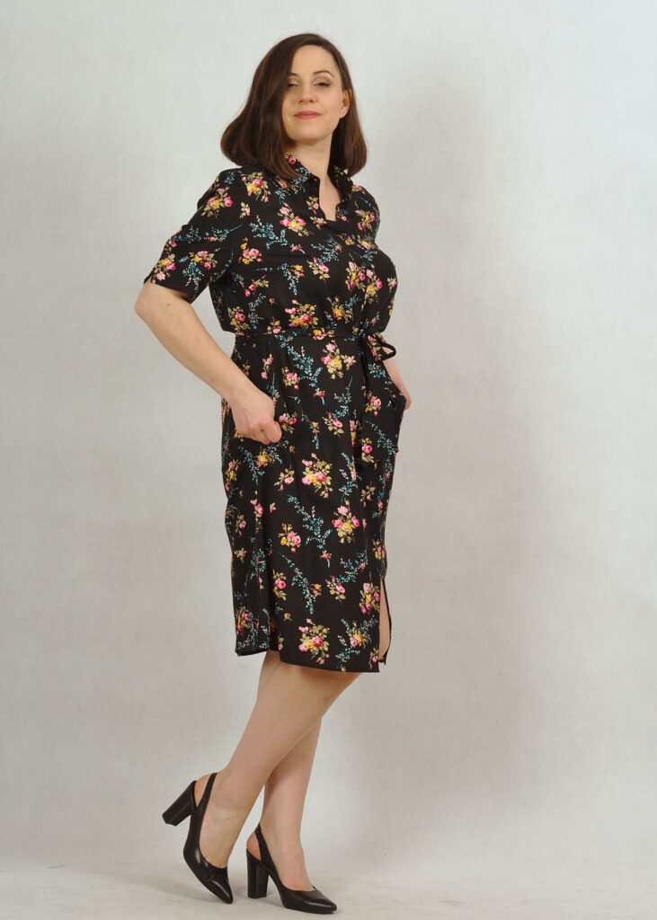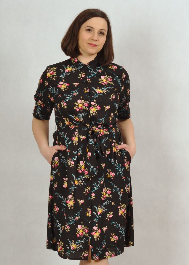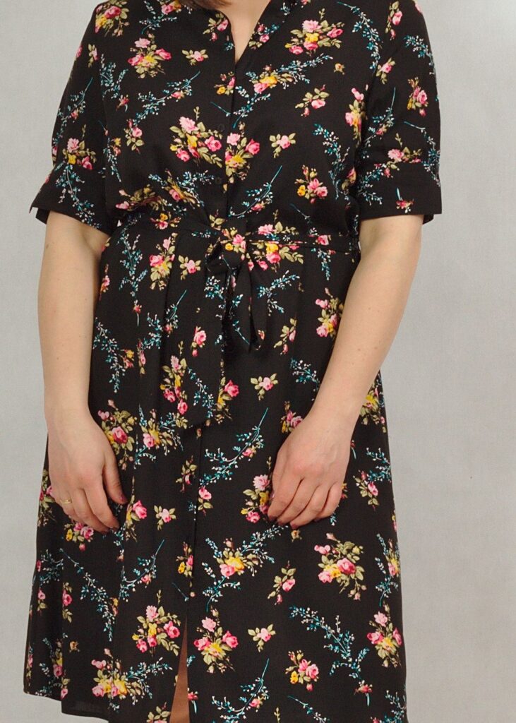 Sukienka w piękne kwiaty, z kołnierzykiem i krótkim rękawem.