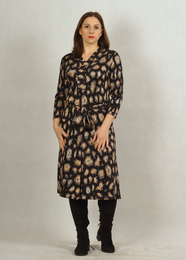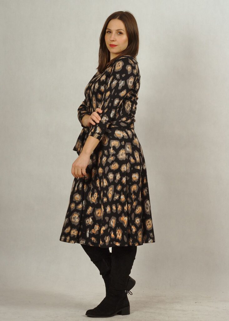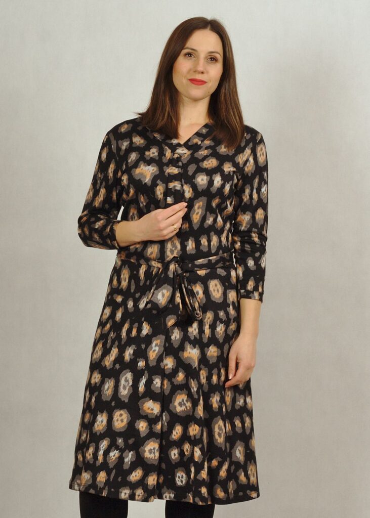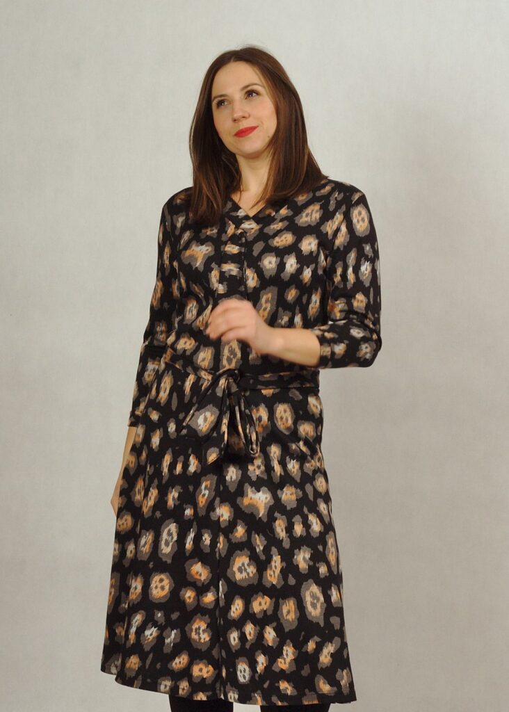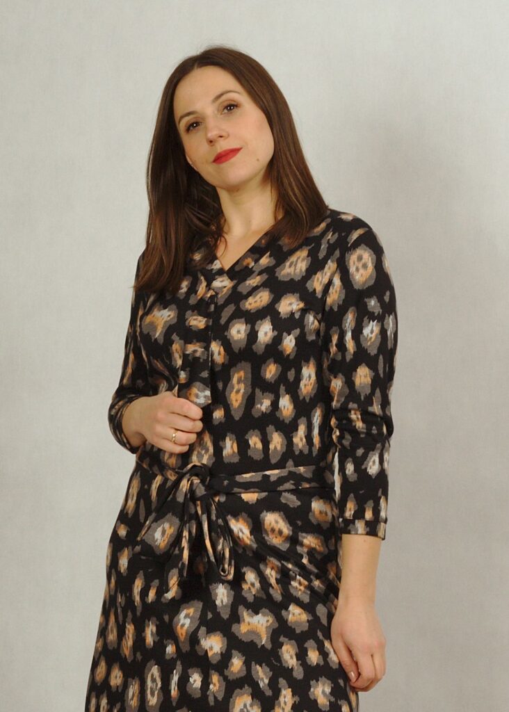 Sukienka ma prosty rękaw 7/8 i dwa wiązania – przy dekolcie oraz w pasie.