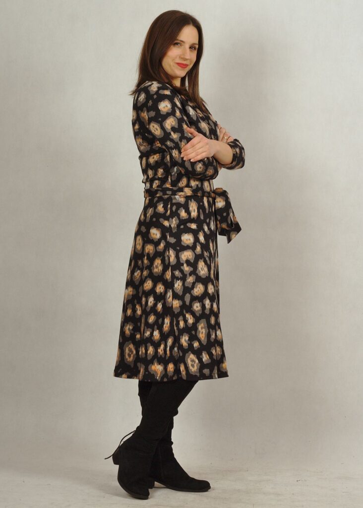 Elegancka sukienka wykonana z mięsistego, jesiennego materiału z domieszką wiskozy.