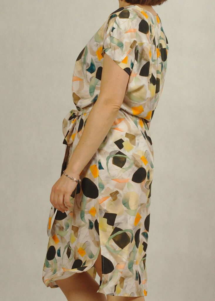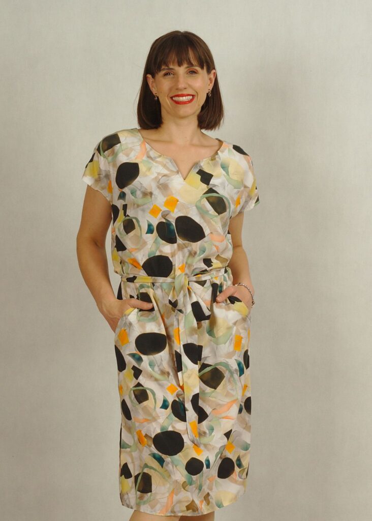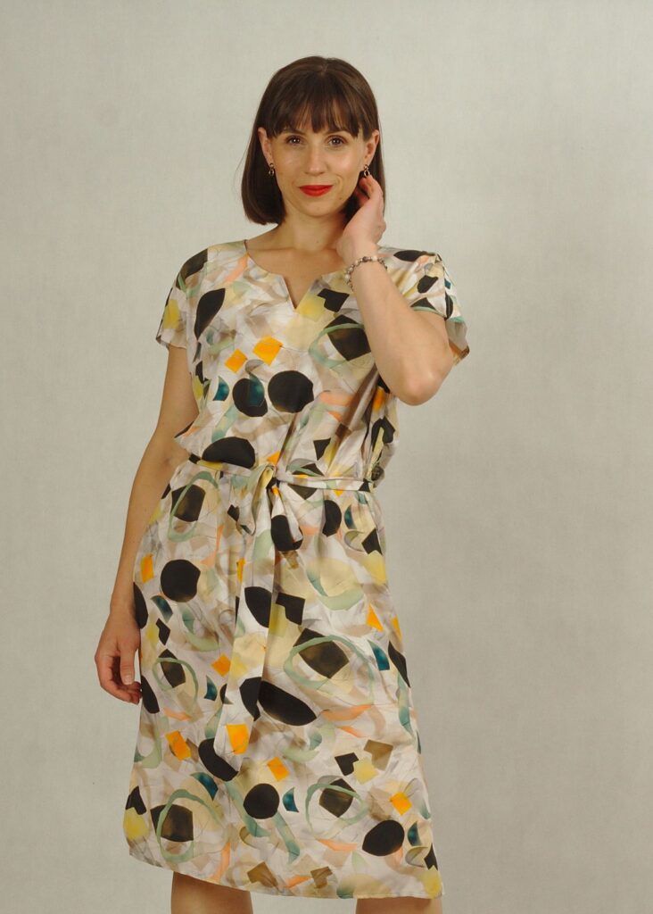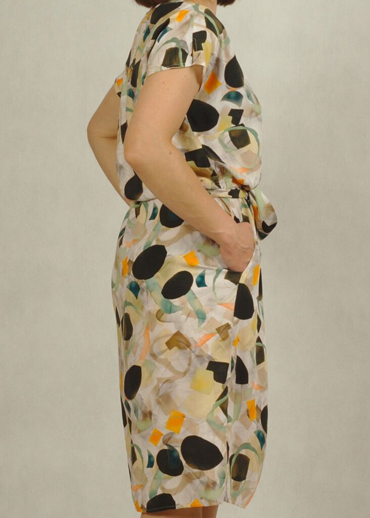 Model posiada piękny dekolt z wycięciem, praktyczne kieszenie oraz pasek podkreślający talię, który optycznie modeluje sylwetkę.