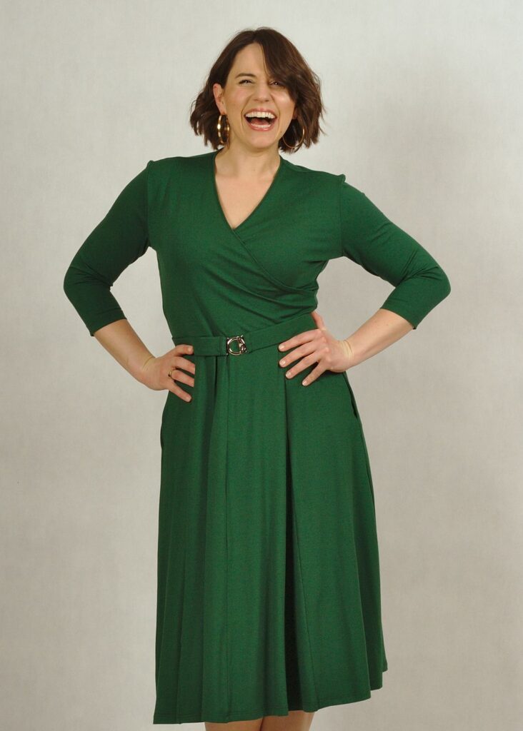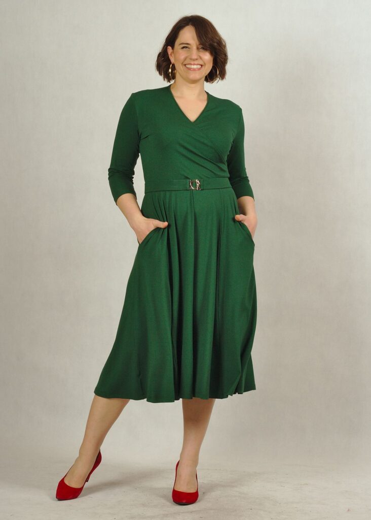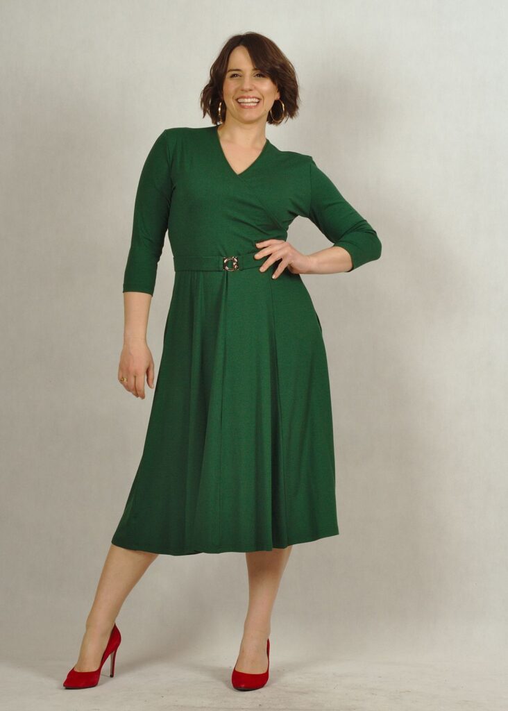 Sukienka ma świetnie skrojony kopertowy dekolt, który pięknie eksponuje biust i wysmukla sylwetkę.