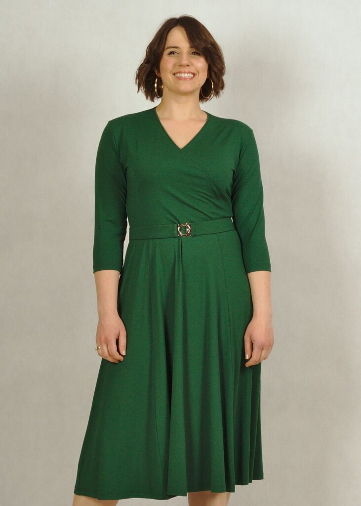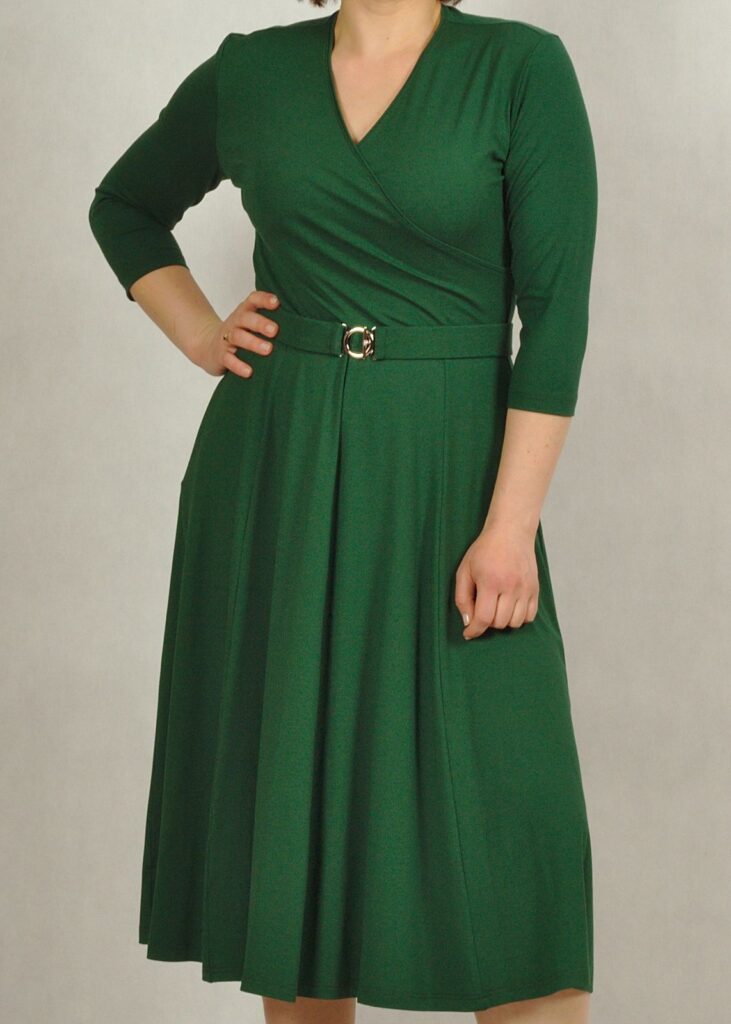 Rękawek sukienki ma długość 3/4 – często wybierany przy rozmiarach plus size.
