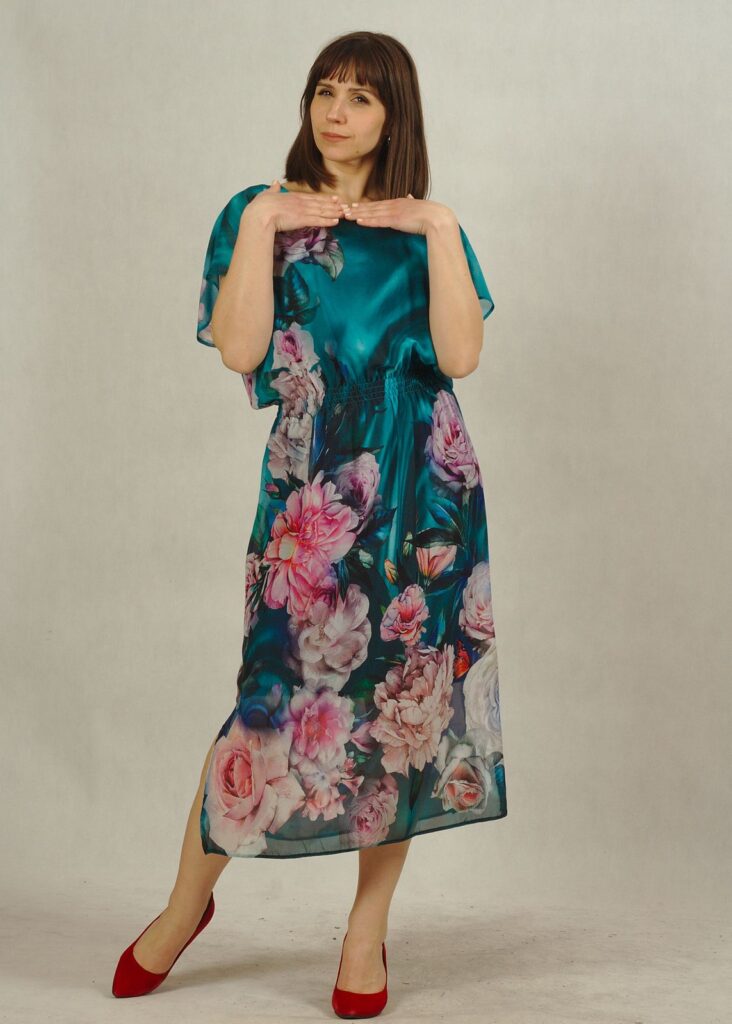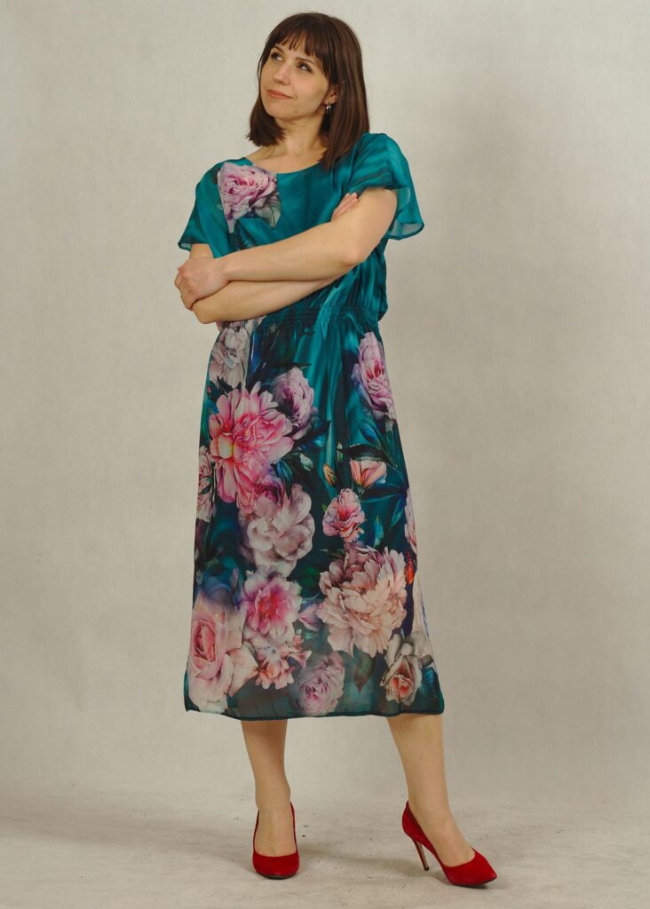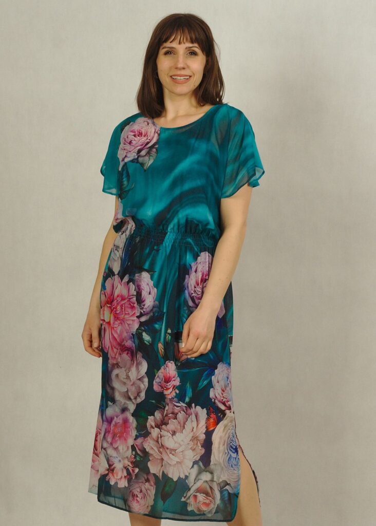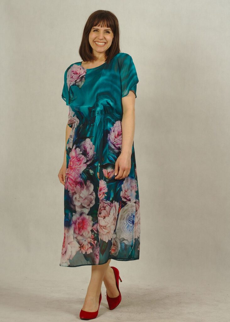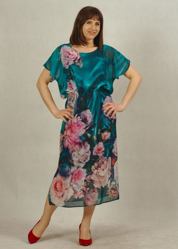 Dzięki wszytej gumce w talii, sukienka wspaniale się układa i podkreśla figurę lub ukrywa niedoskonałości.