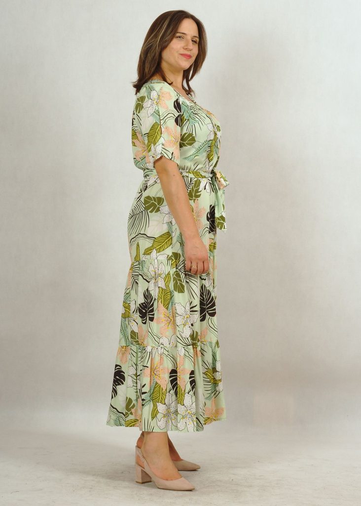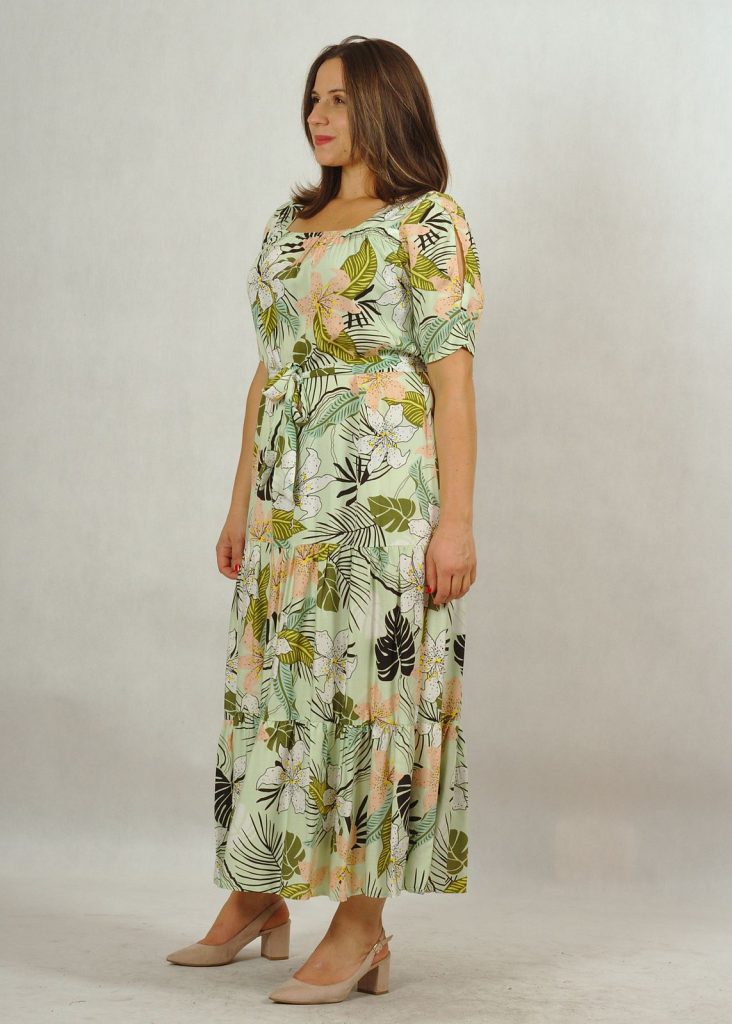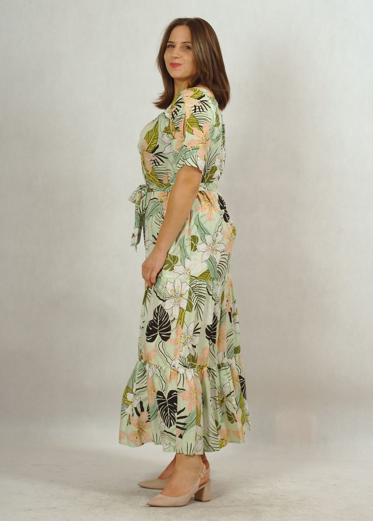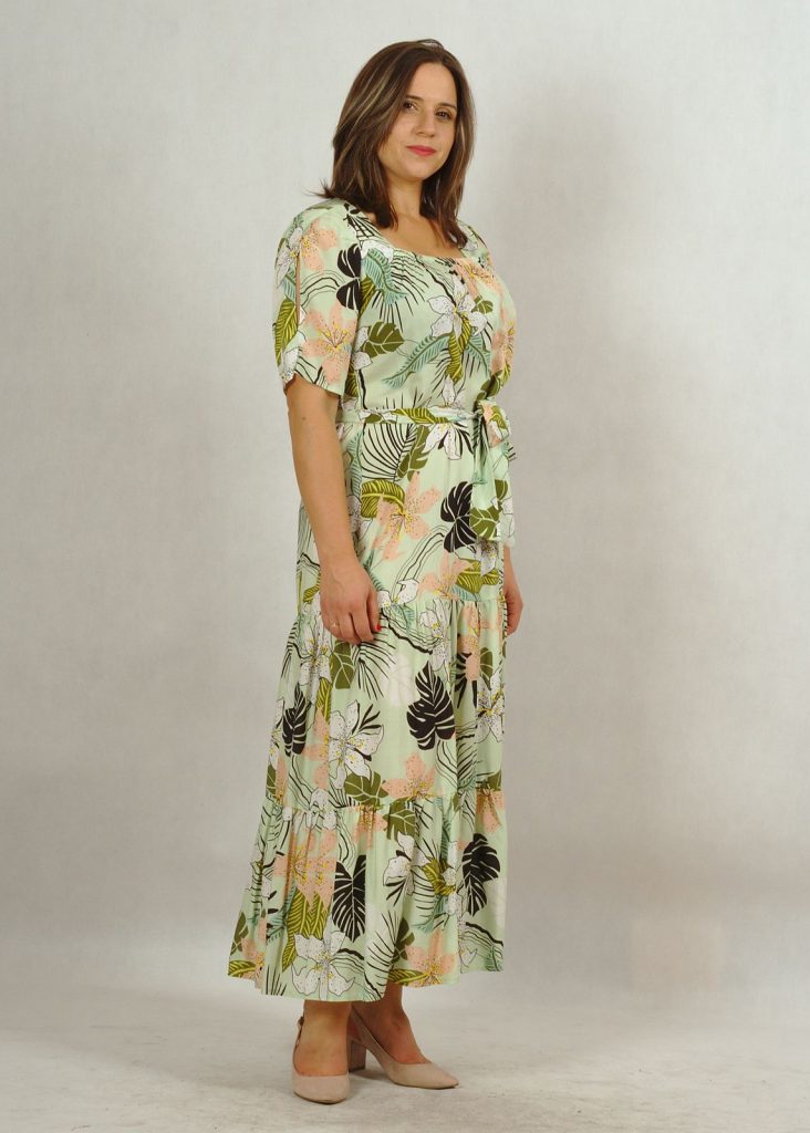 Suknia długa miętowa z falbanami z printem w kwiaty /625/