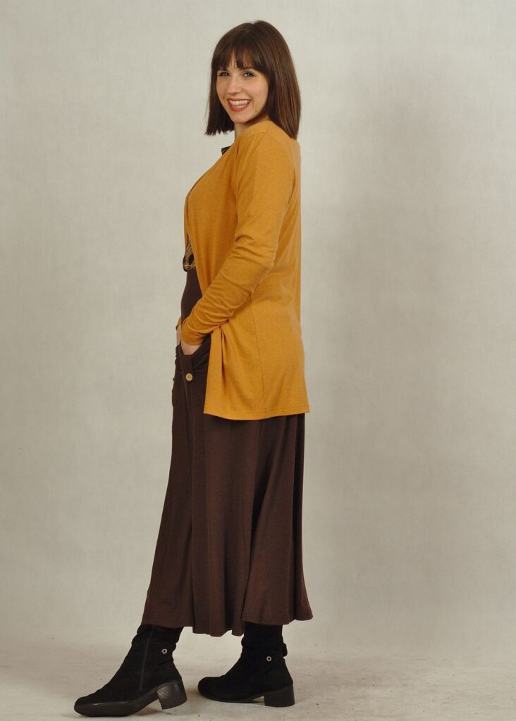 Sweterek miodowy jest ponadczasowy i pasuje kolorystycznie do wielu ciepłych odcieni, zwłaszcza brązów.