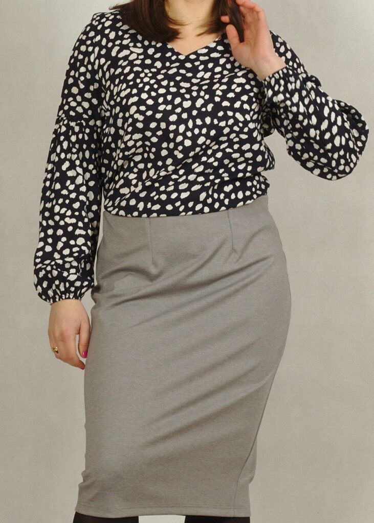 Spódnica ma długość delikatnie za kolano.
