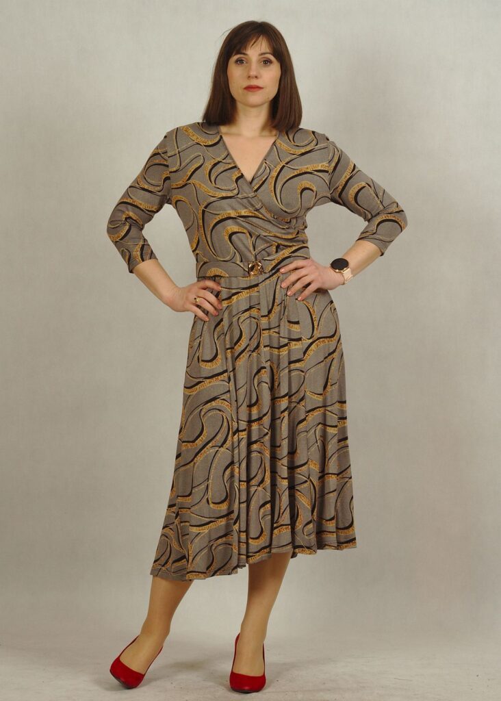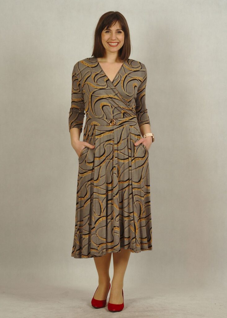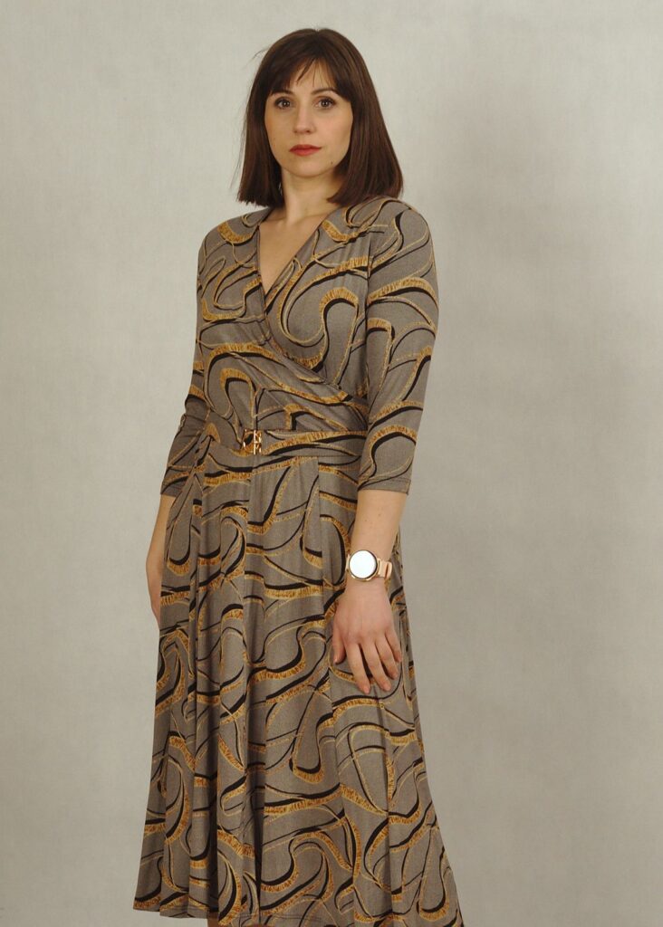 Sukienka z kopertowym dekoltem to nowa propozycja dla Damy, która doskonale podkreśla biust oraz talię