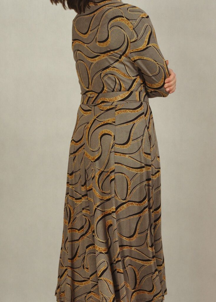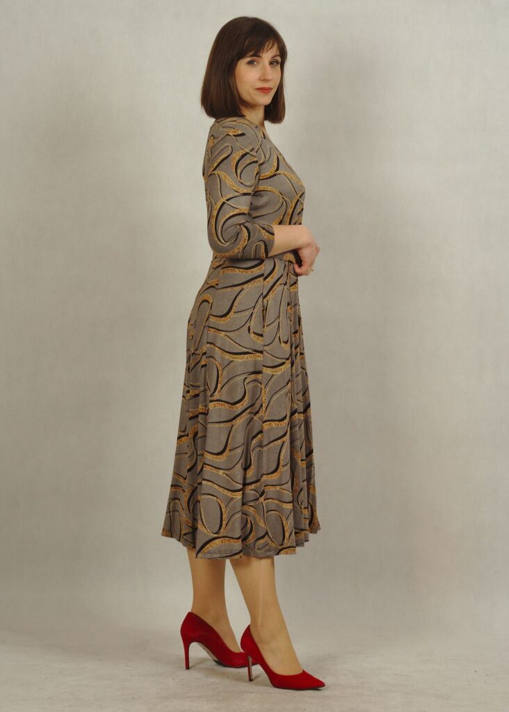 Sukienka elegancka, pomimo że uszyta została z dzianiny wiskozowej.