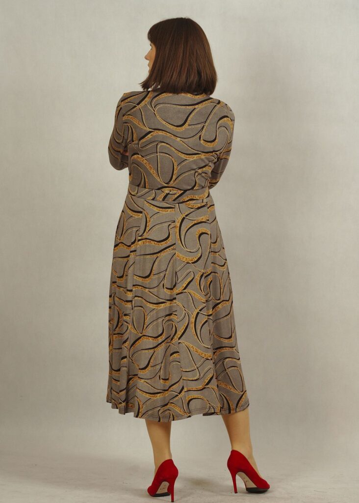 Sukienka szara we wzory w kolorze złotym.