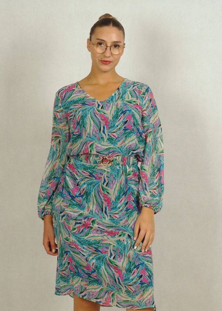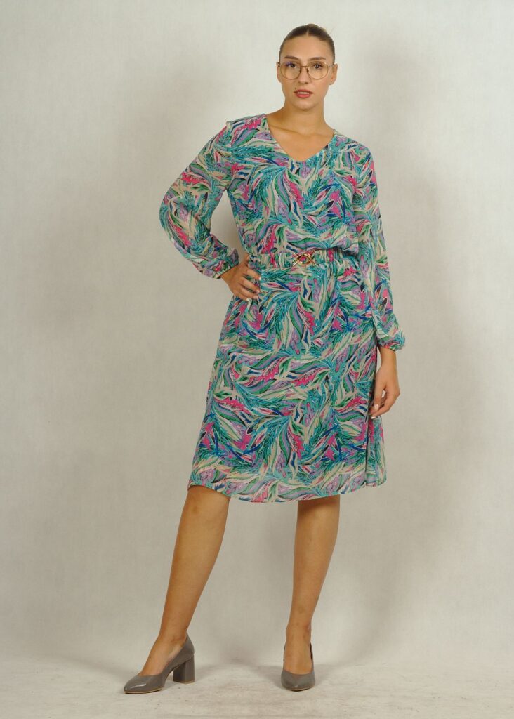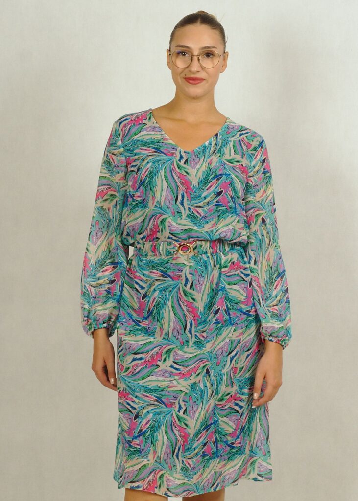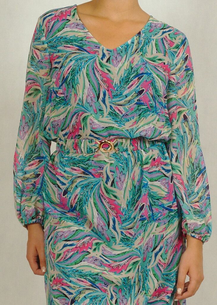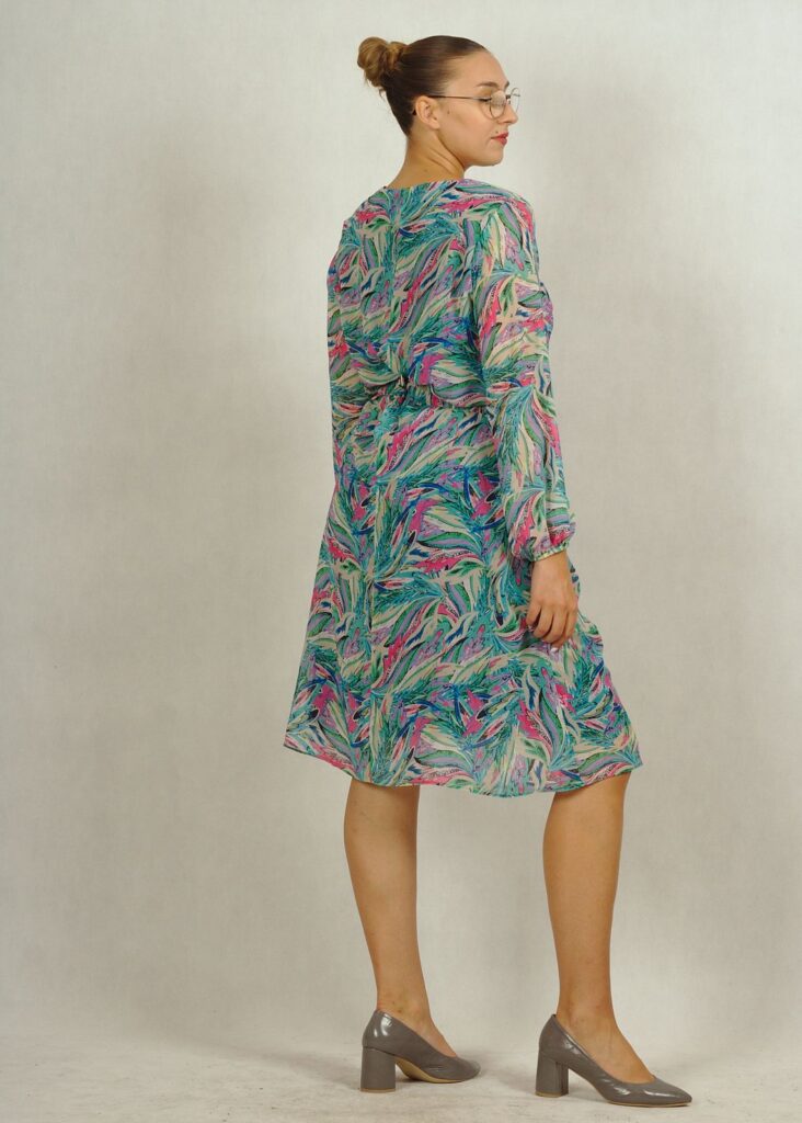 Sukienka ma długi, nieopinający rękaw na gumce i dopracowany dekolt w serek.