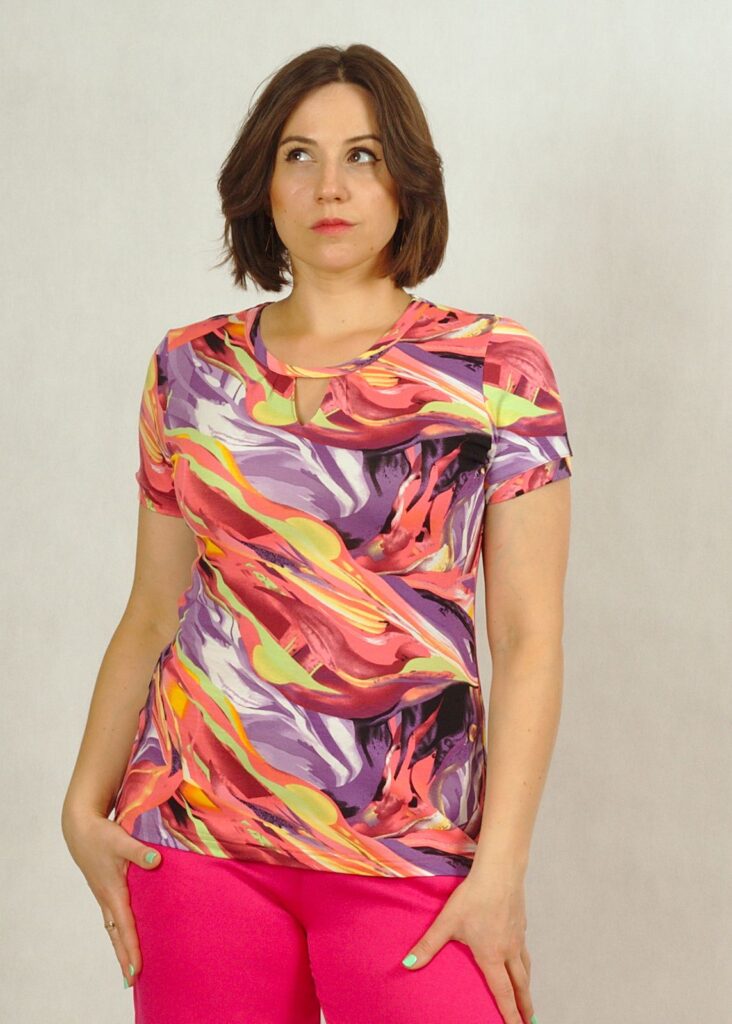 T-shirt wielokolorowy we wzory z łezką przy dekolcie plus size /775/