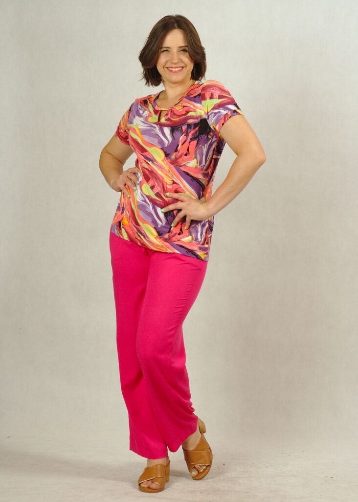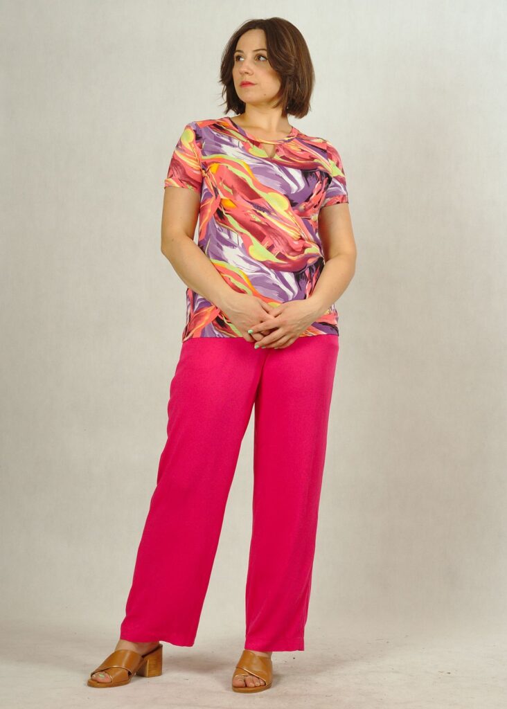 T-shirt wielokolorowy w odcieniach fioletu i brudnego różu* wykonany z najwyżej jakości dzianiny wiskozowej.