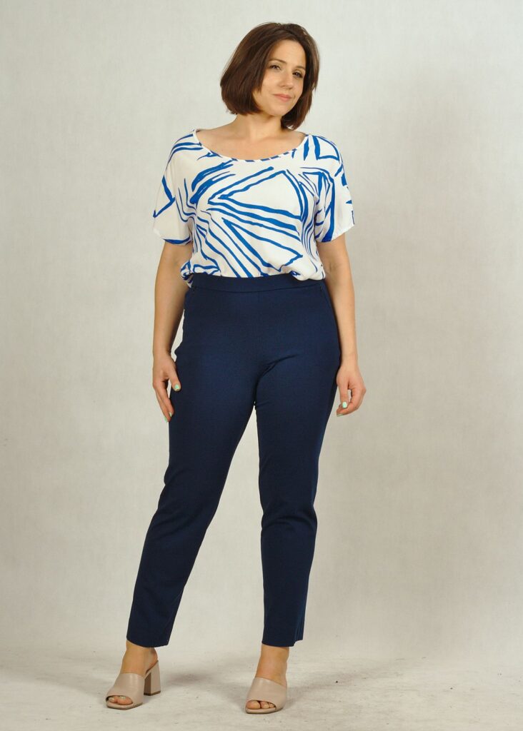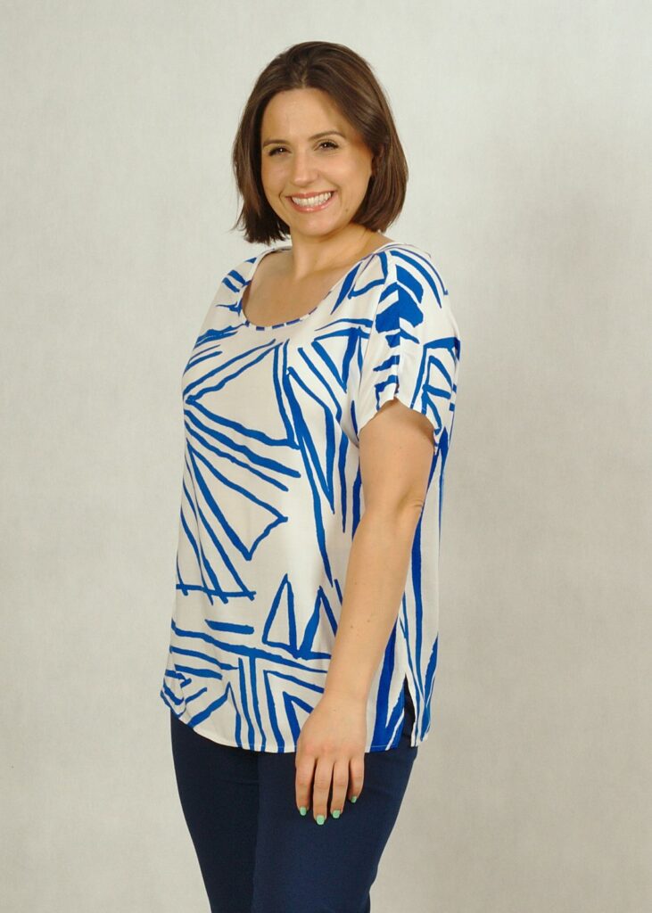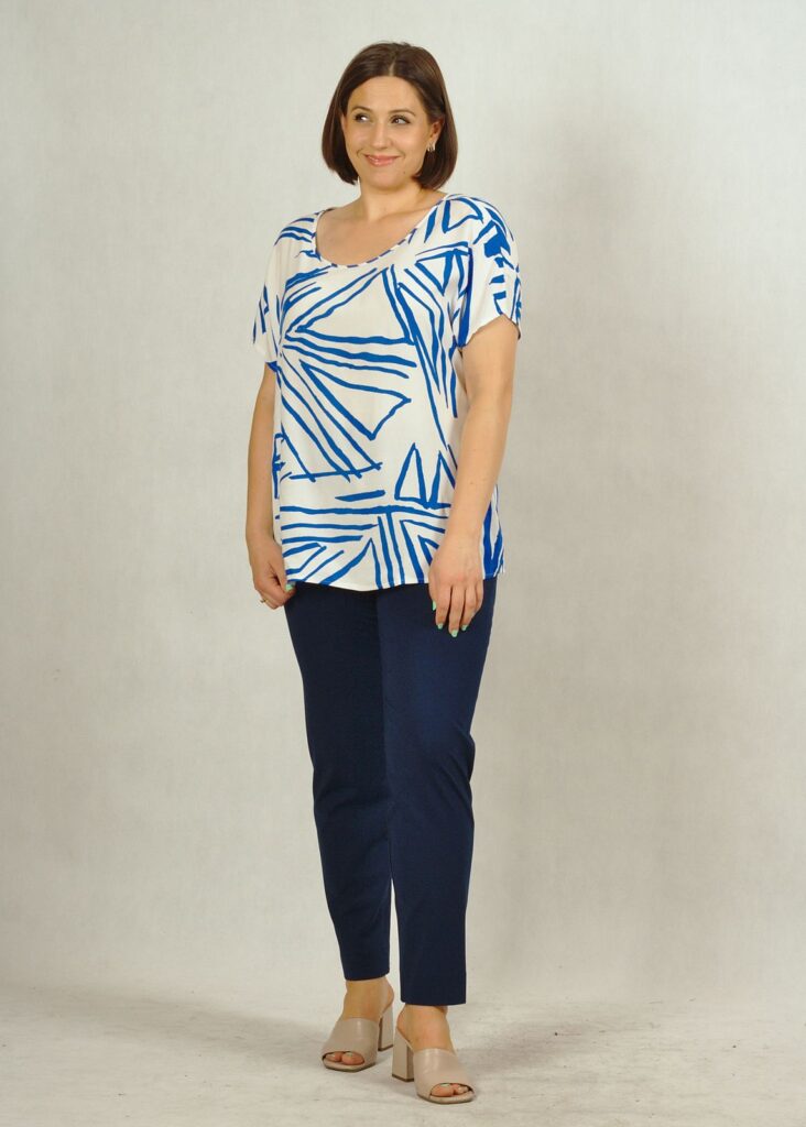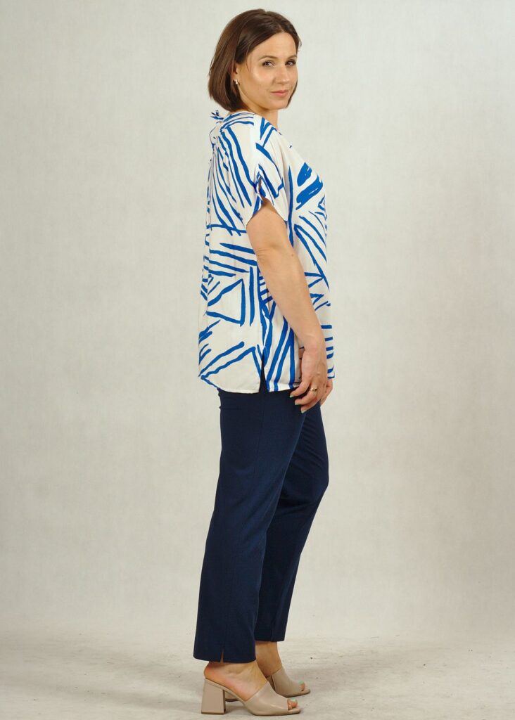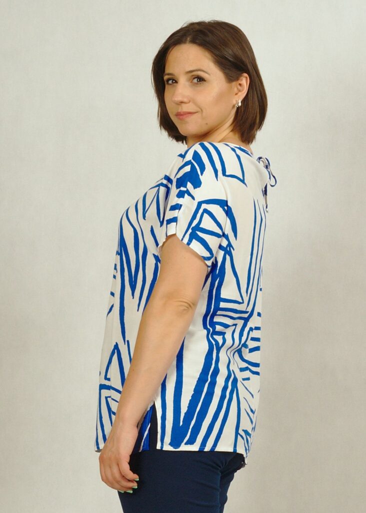 Kolor bazowy bluzki – biel*, w piękne chabrowe geometryczne wzory.