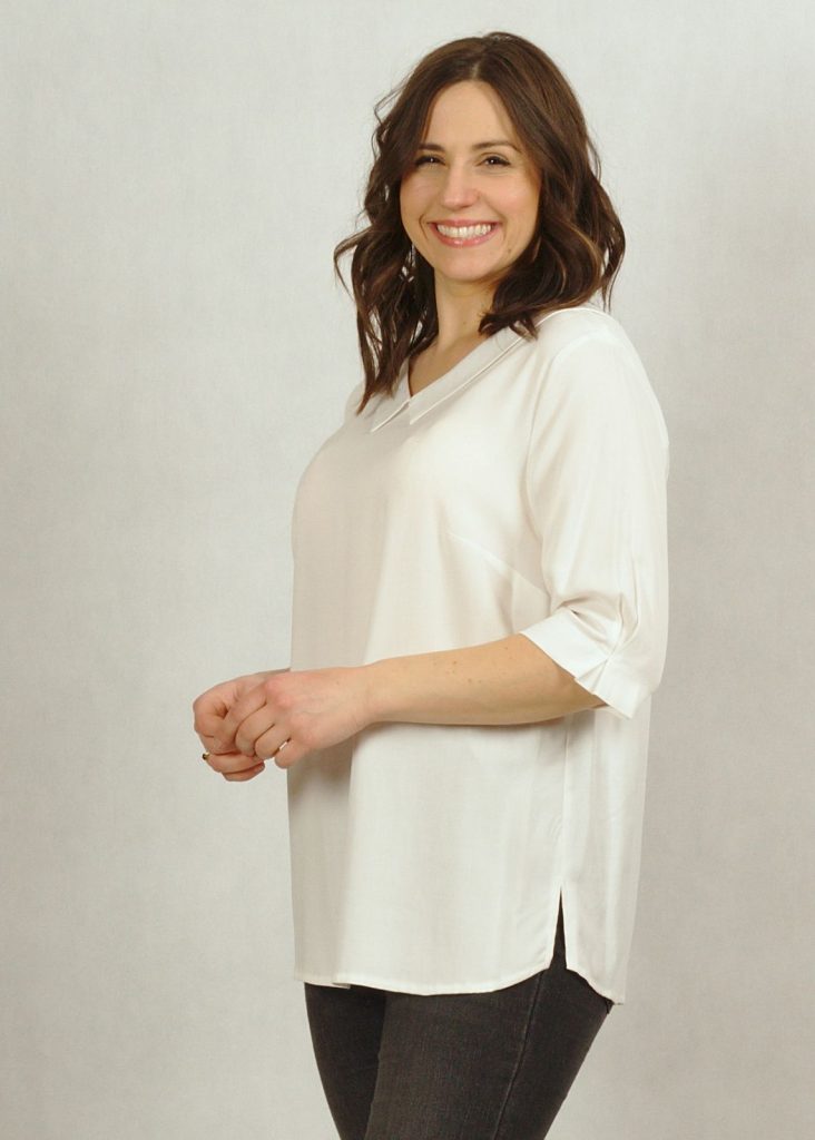 Bluzka posiada rękaw 3/4 i dekolt z kołnierzykiem w serek.