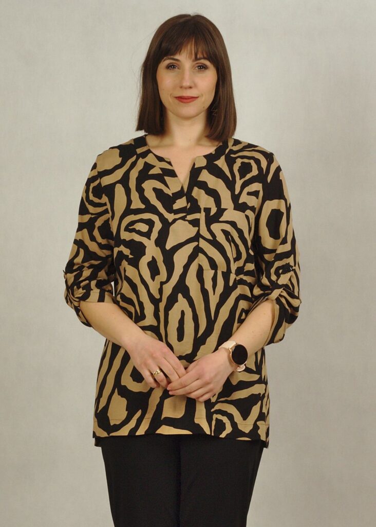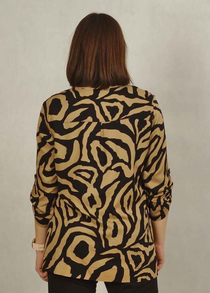 Beżowa bluzka ozdobiona jest eleganckimi, czarnymi wzorami, które dodają jej charakteru.