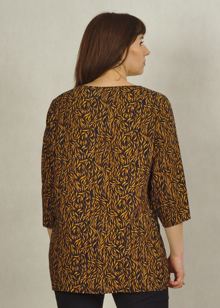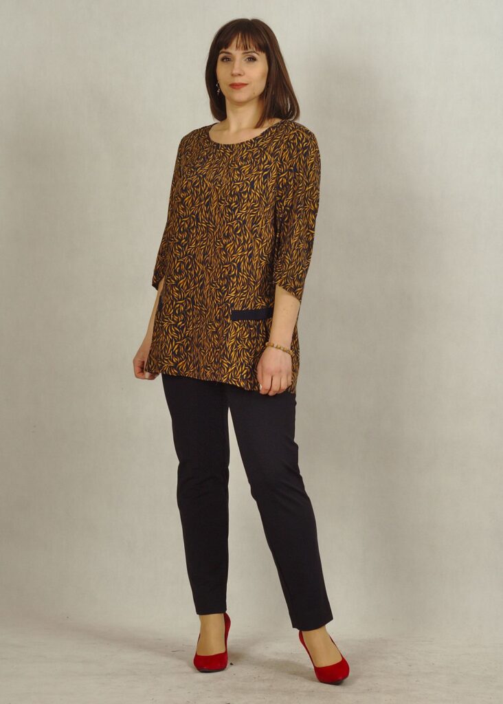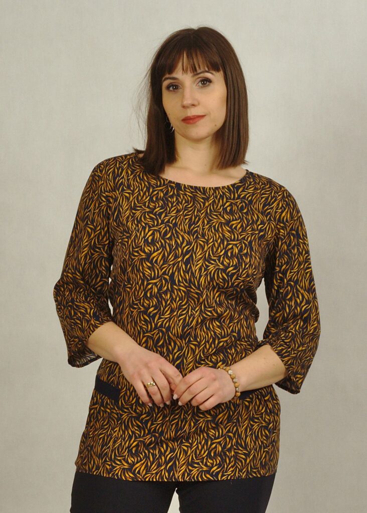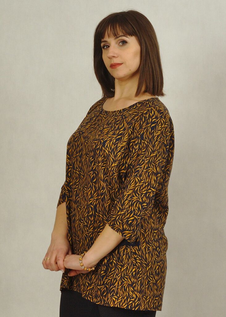 Ta zwiewna, tkaninowa bluzka w kolorze granatowo – miodowym urzeka subtelnymi wzorami, które nadają jej niepowtarzalny styl.
