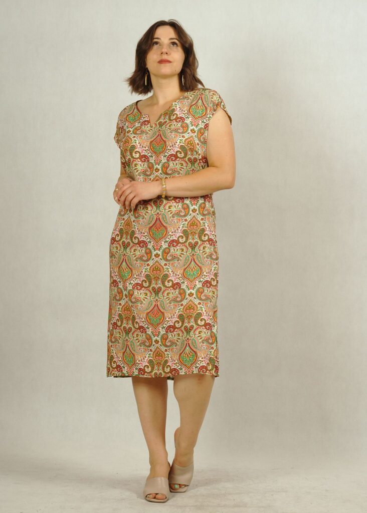 Ta letnia sukienka tkaninowa ma prosty fason i długość za kolano.