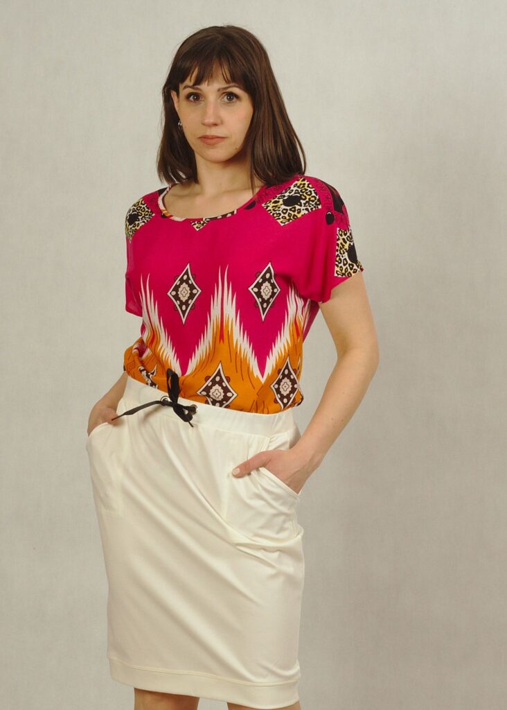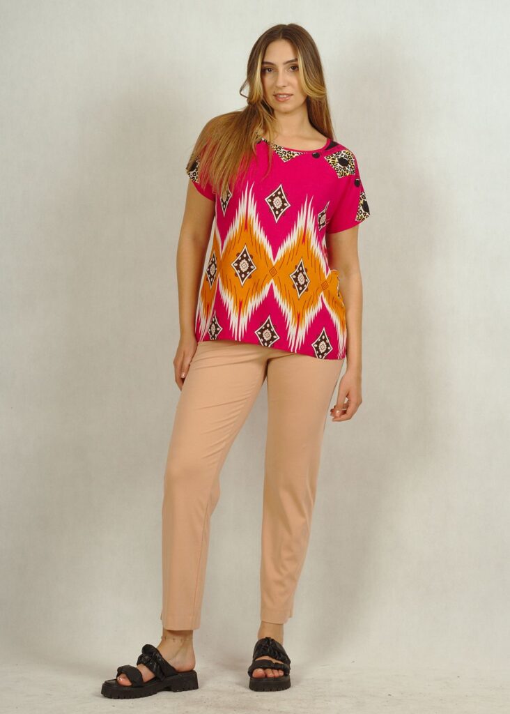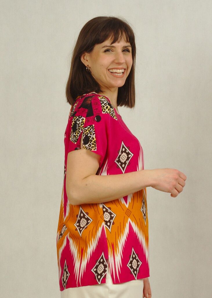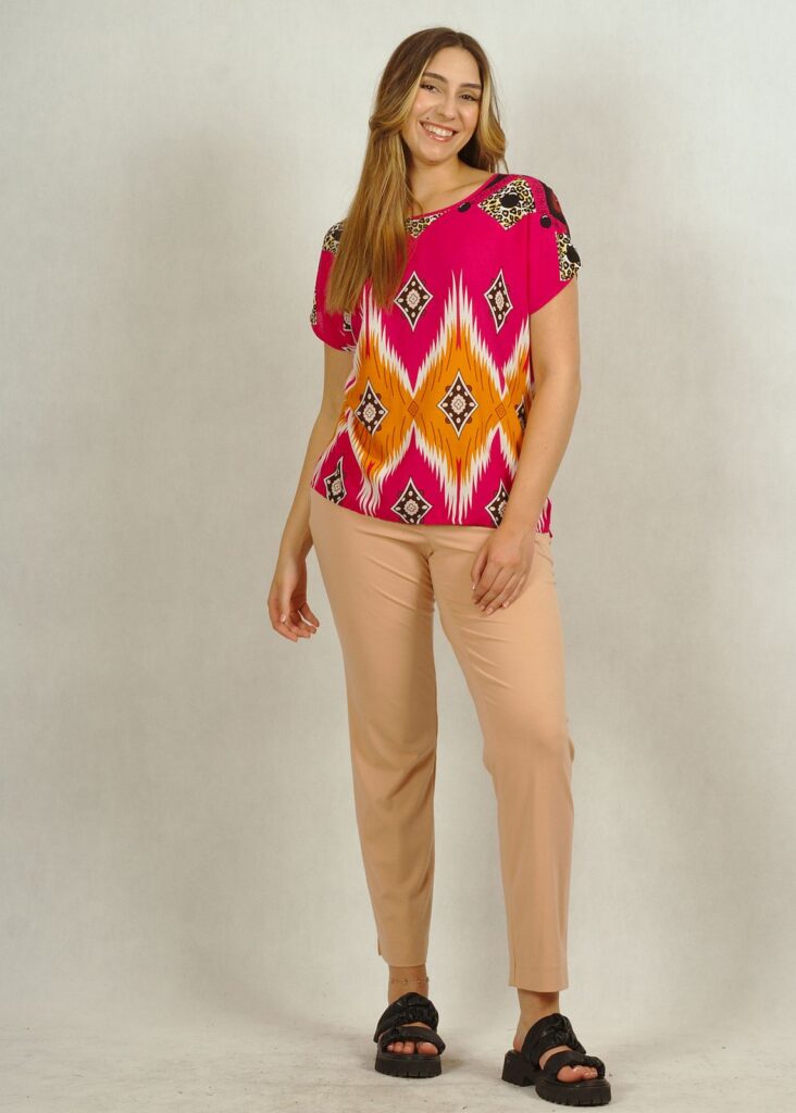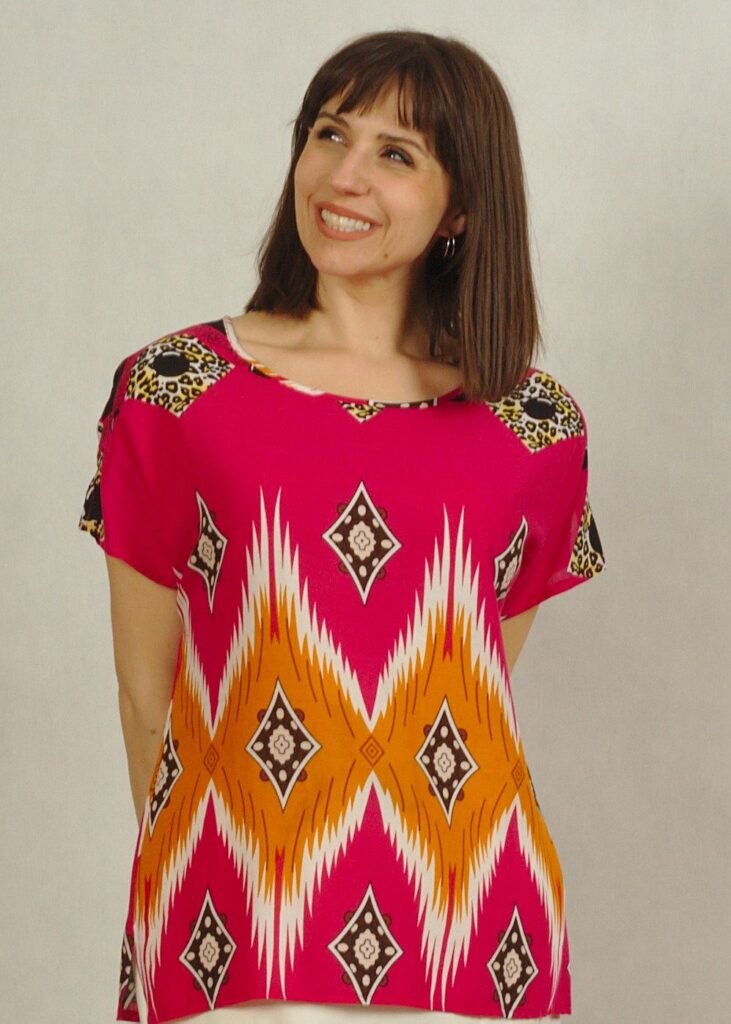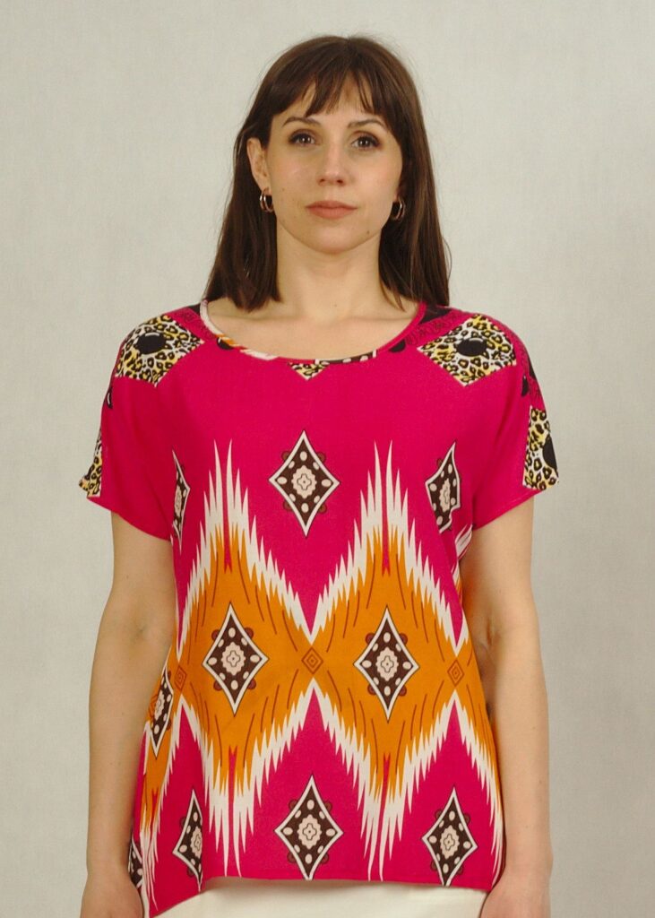 Kolor bazowy bluzki to mocny róż, w piękne pomarańczowe i czarne wzory.