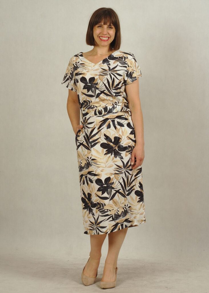 Ta jasna, lekka sukienka w beżowo-czarny* kwiatowy wzór to, must-have na lato.