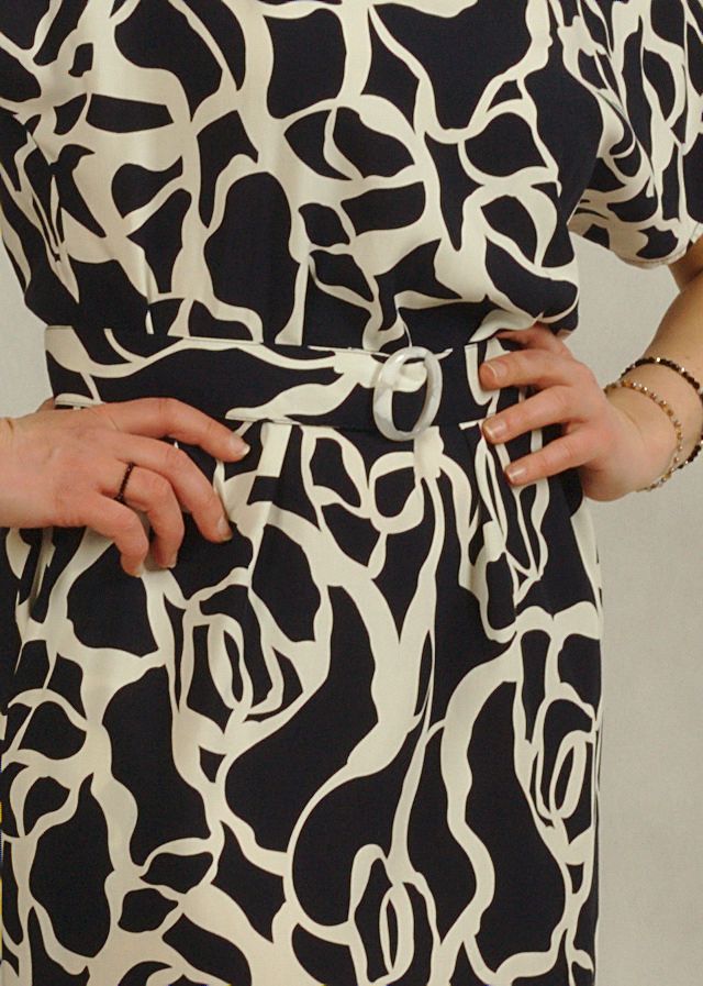 Tkaninowa sukienka z kimonowym rękawkiem i paskiem – granatowa w białe wzory /849/