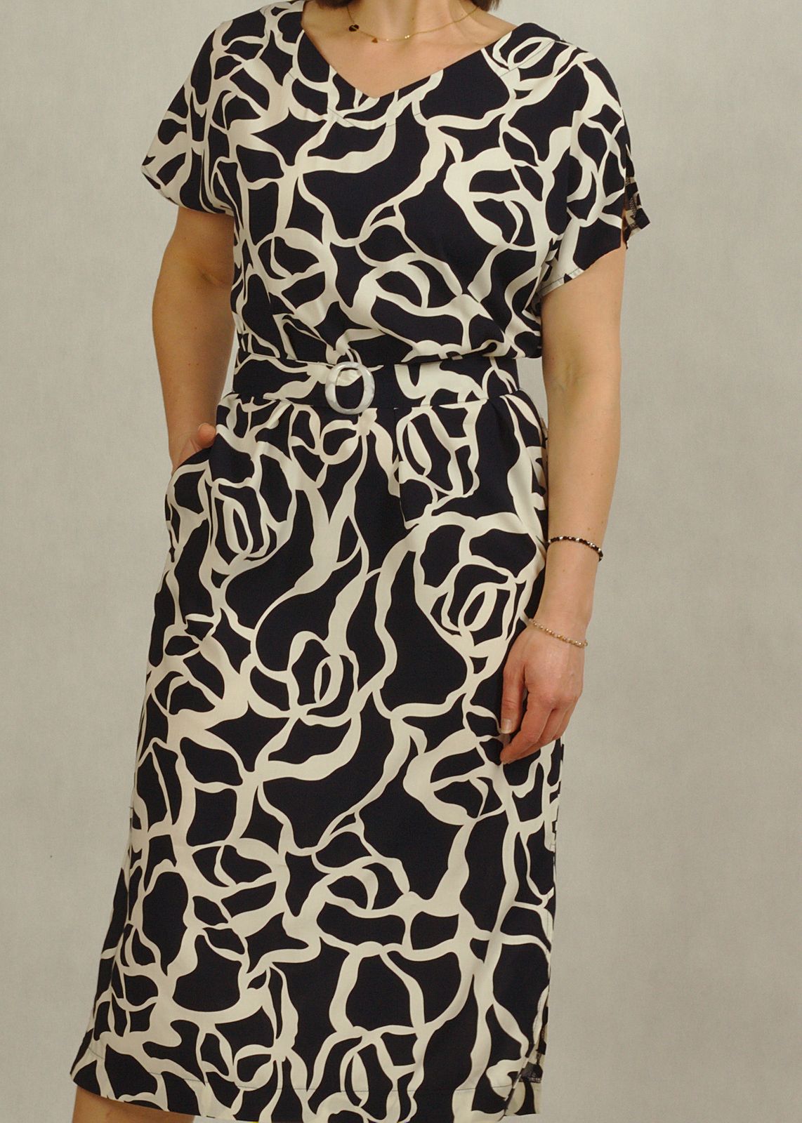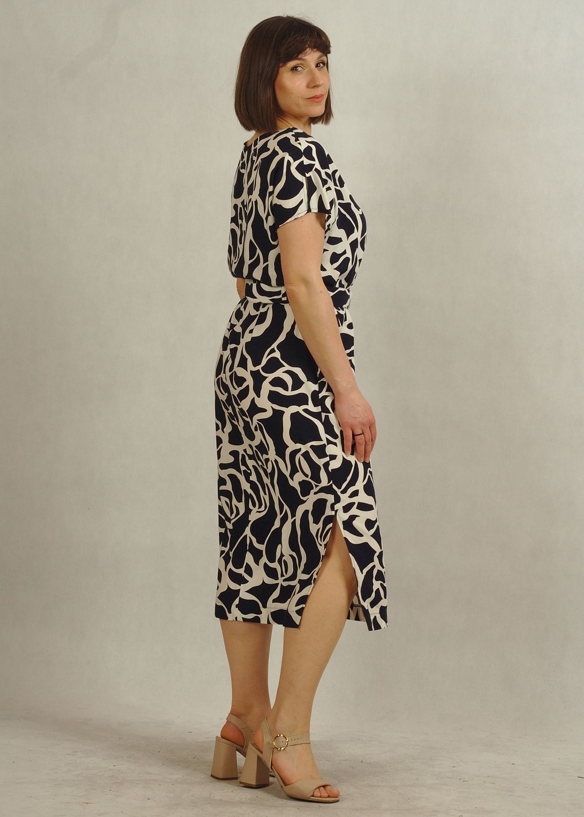 Sukienka midi w wyjątkowe białe wzory, świetnie wpisuje się w elegancki klimat.