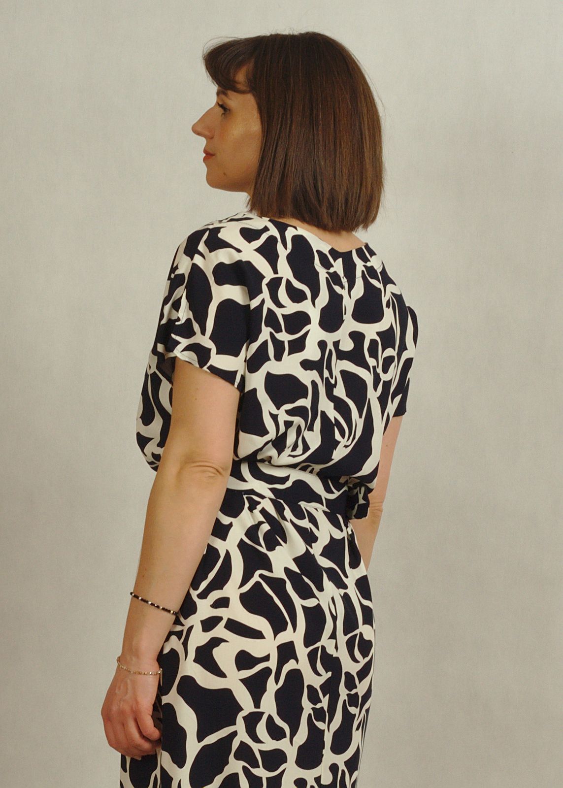 Tkaninowa sukienka z kimonowym rękawkiem i paskiem – granatowa w białe wzory /849/