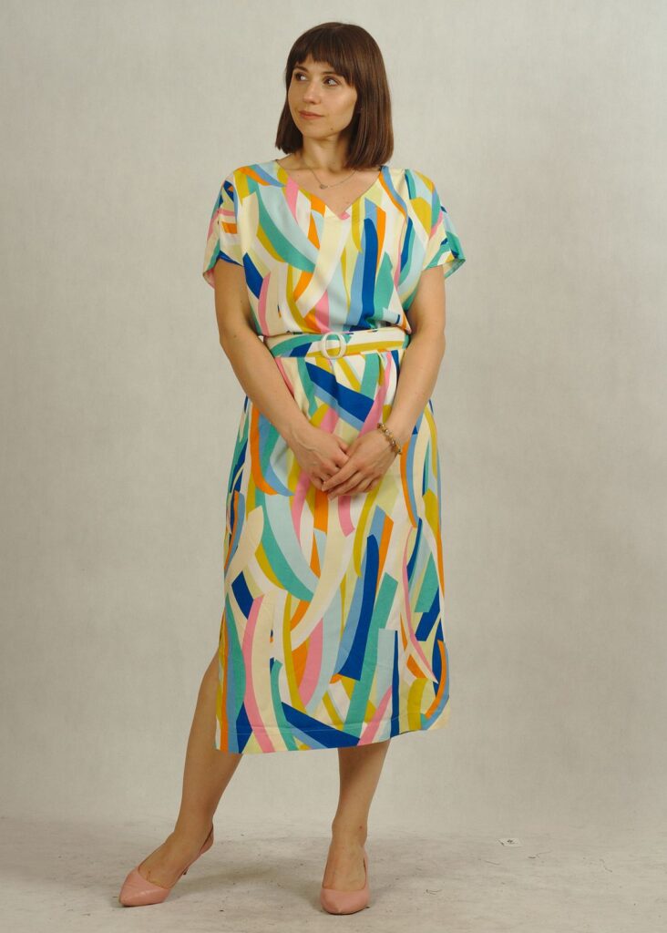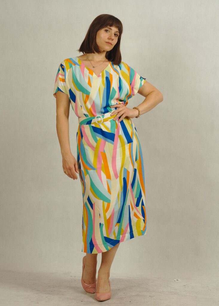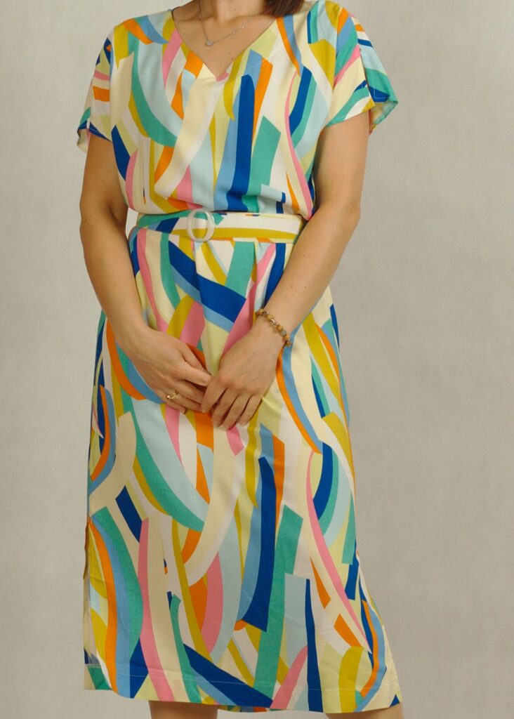 Sukienka midi we wzory, w tym kolorowe i wielobarwne printy, świetnie wpisuje się w wakacyjny klimat.
