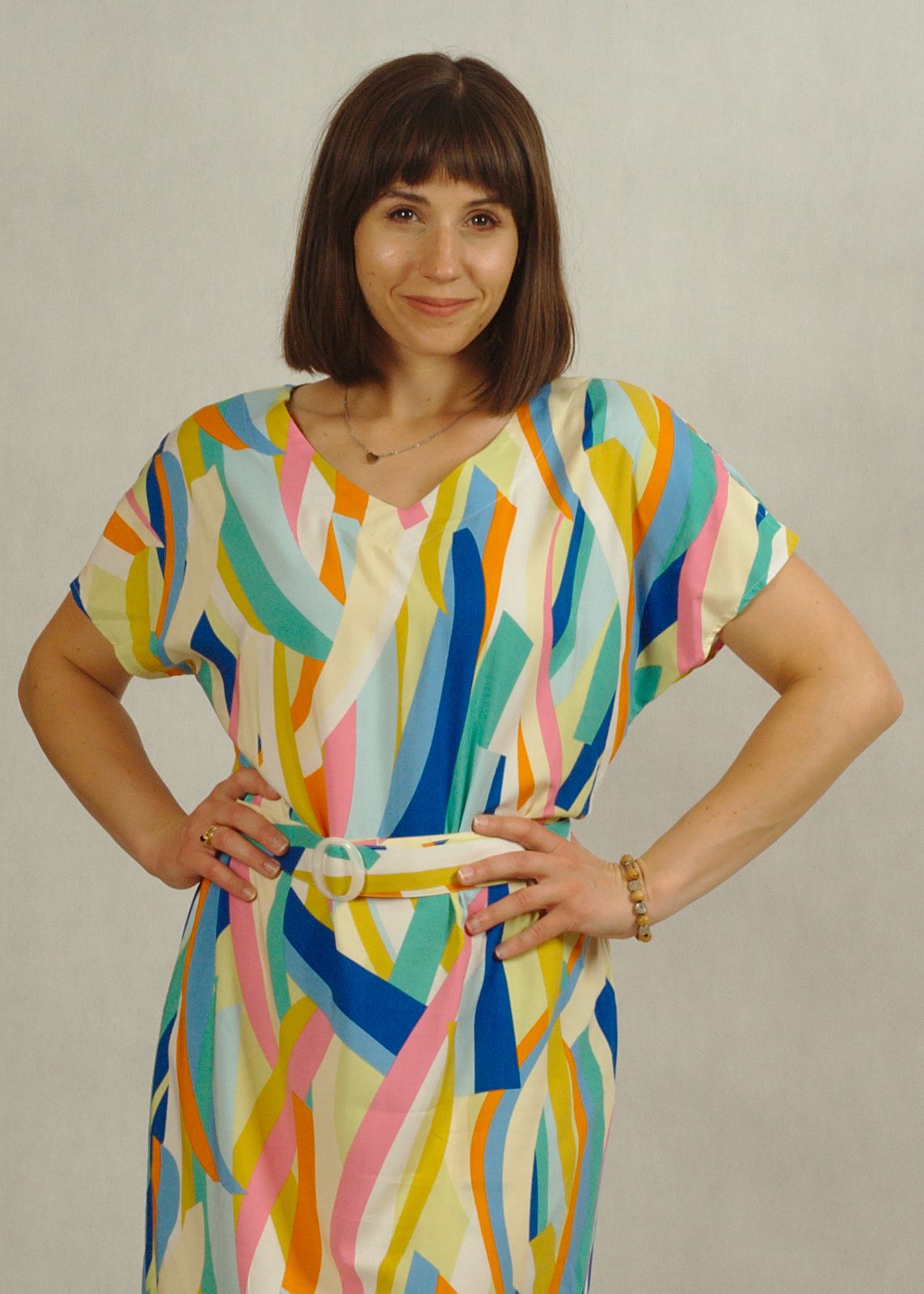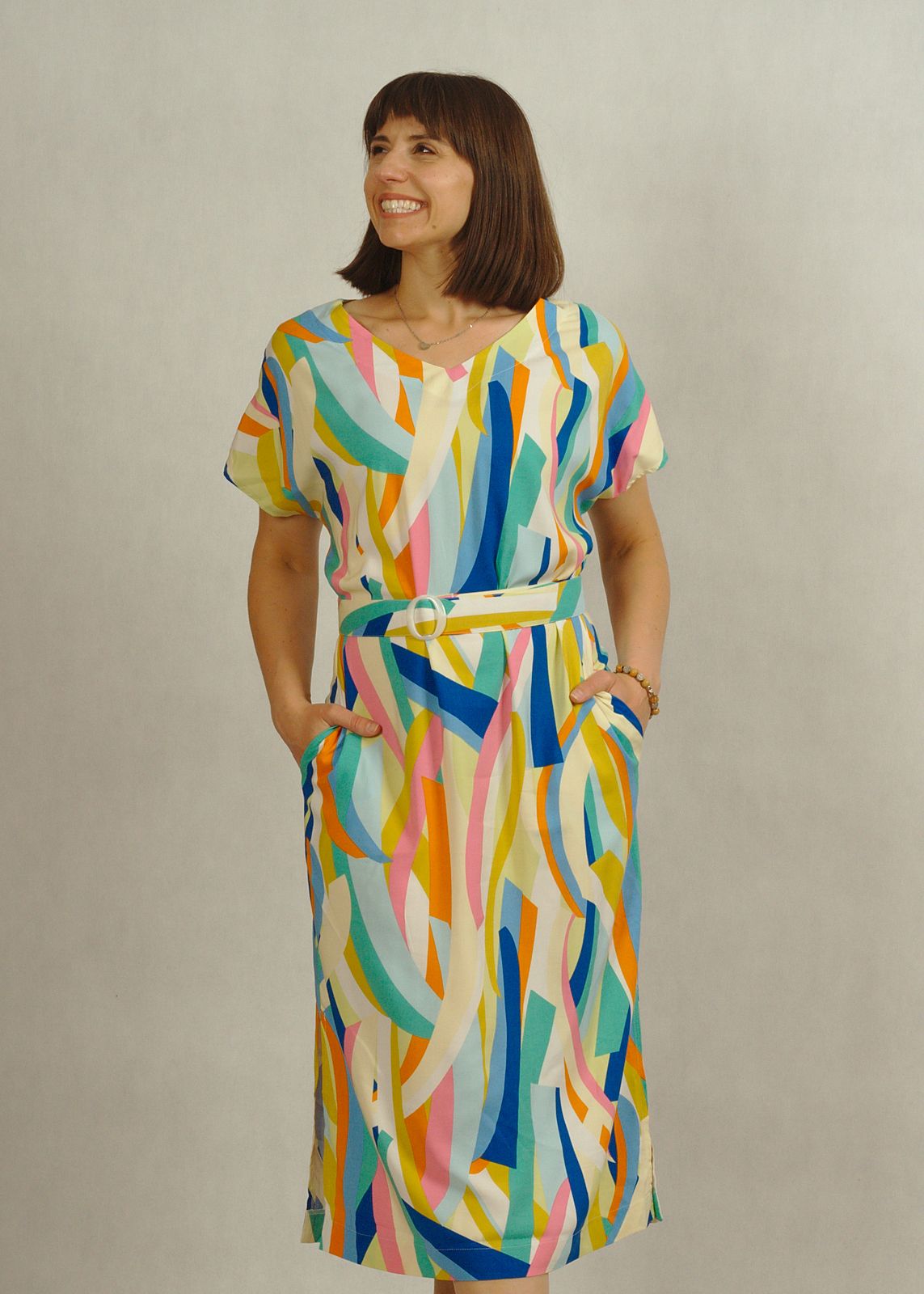 Tkaninowa sukienka z kimonowym rękawkiem i paskiem – multicolor jasny /849/