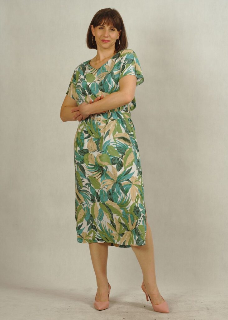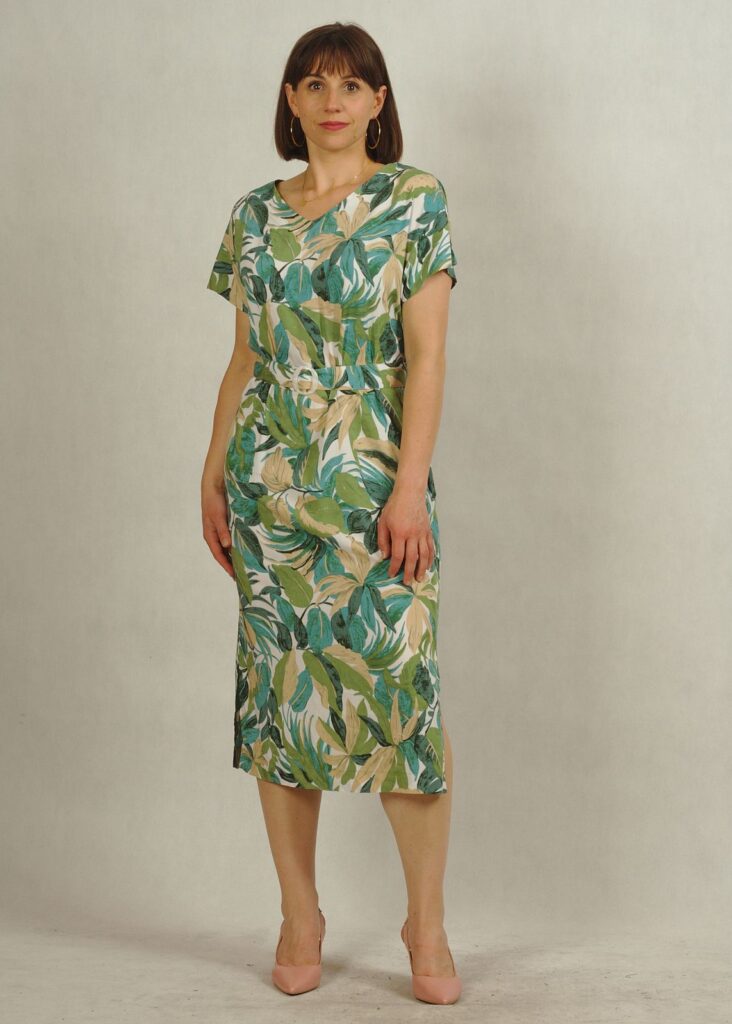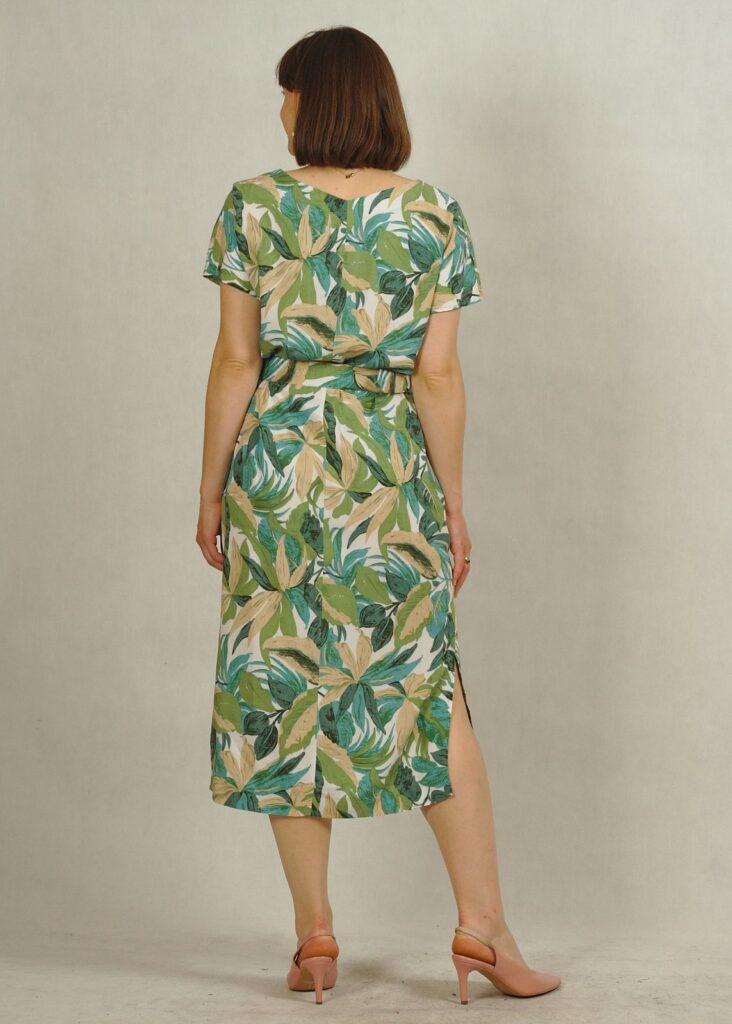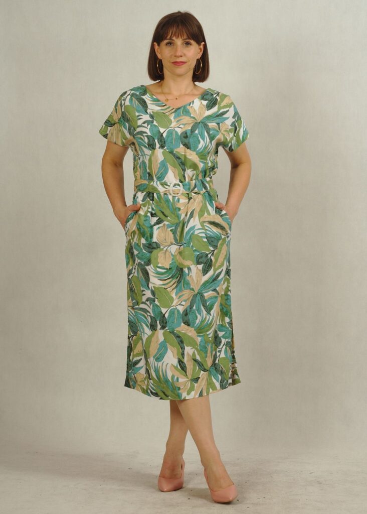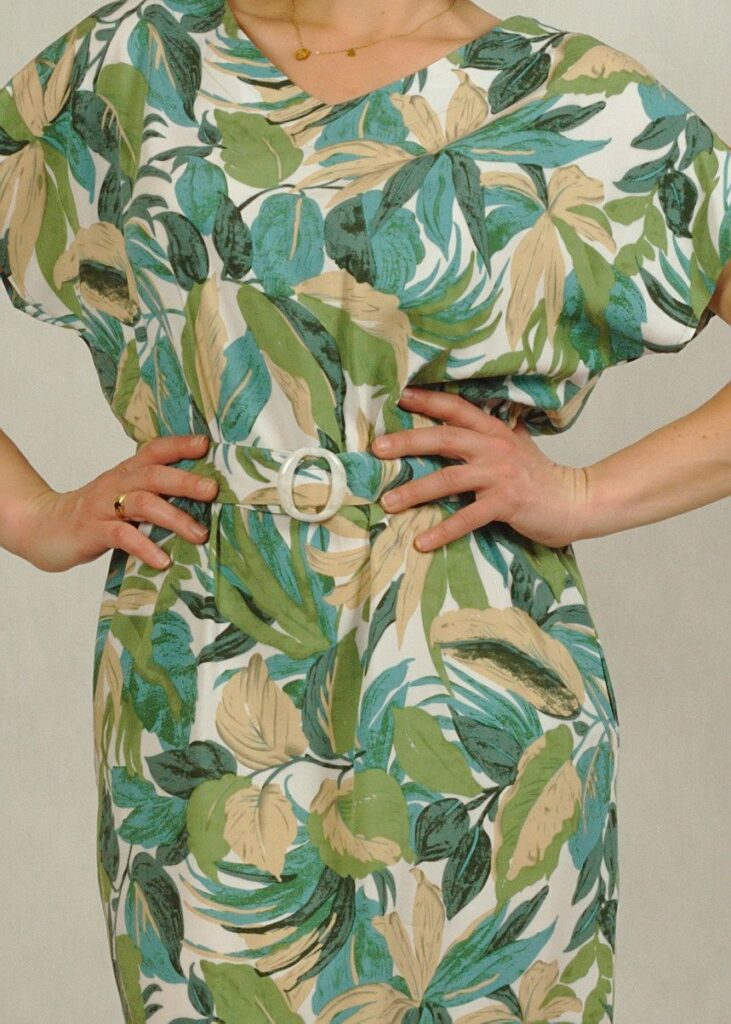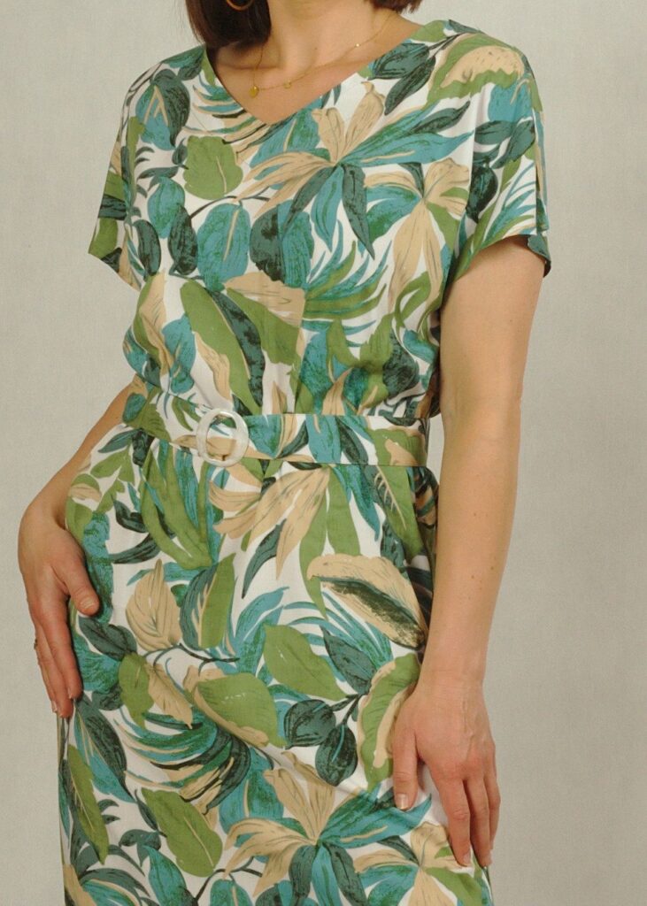 Tkaninowa sukienka z kimonowym rękawkiem i paskiem – zielone liście /849/