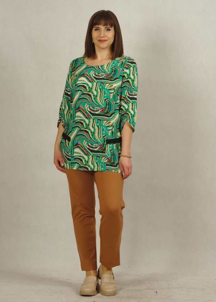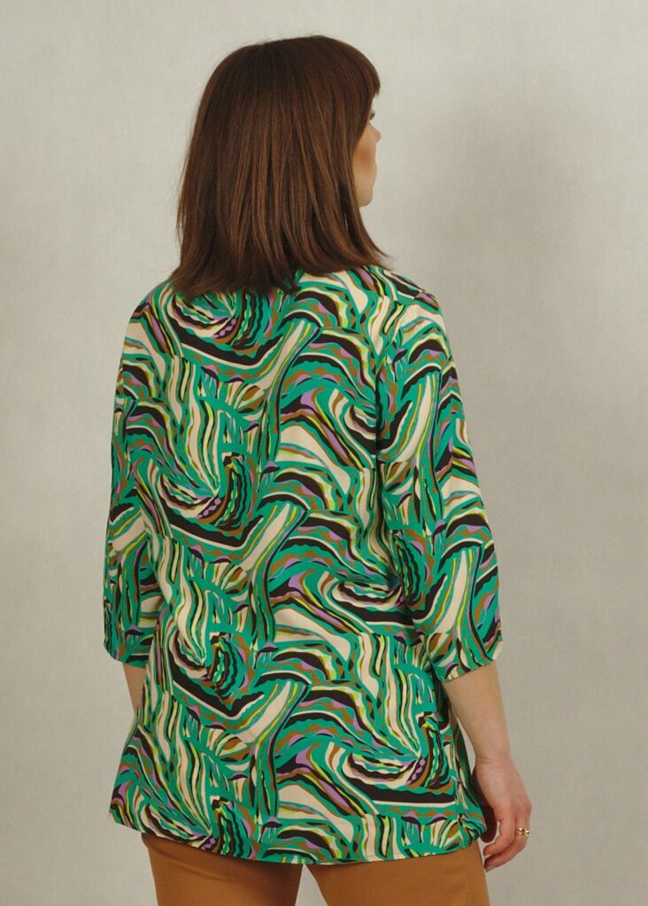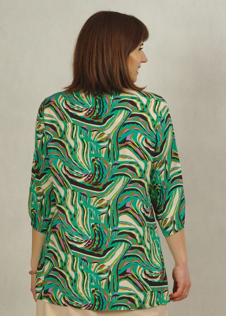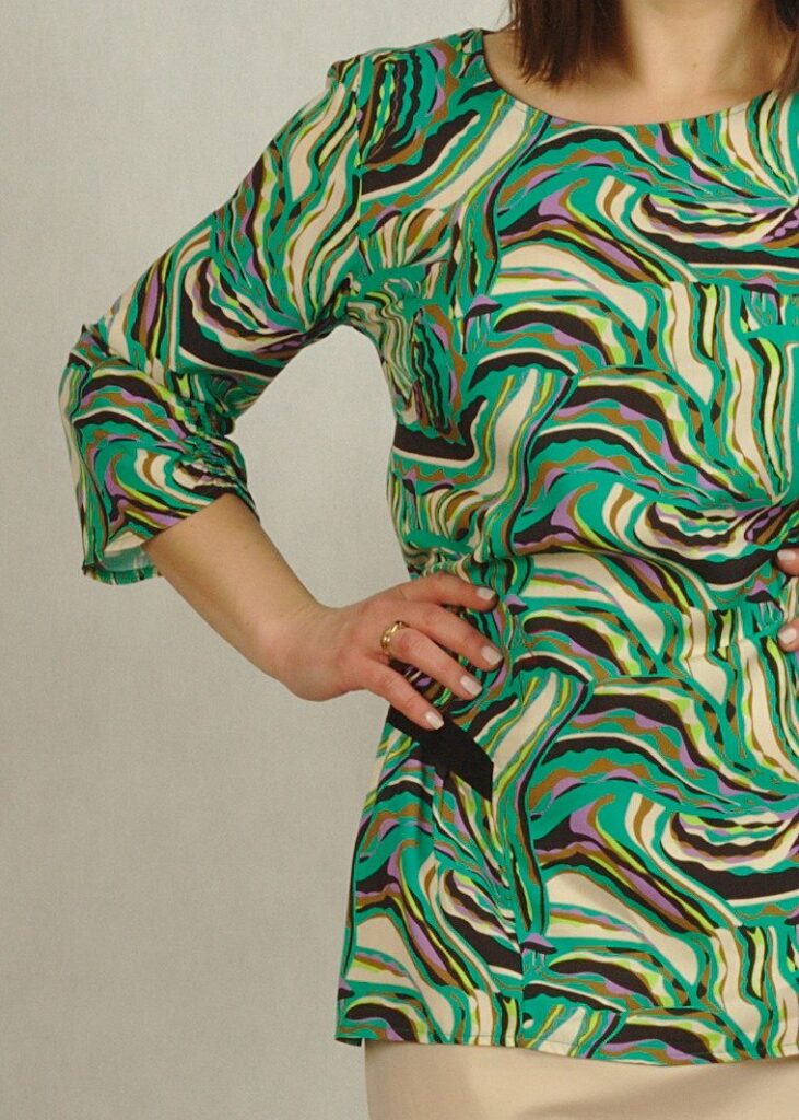 Zielona bluzka we wzory z rękawem 3/4 łączy w sobie wygodę i styl, doskonale sprawdzając się zarówno w codziennych, jak i bardziej eleganckich stylizacjach.