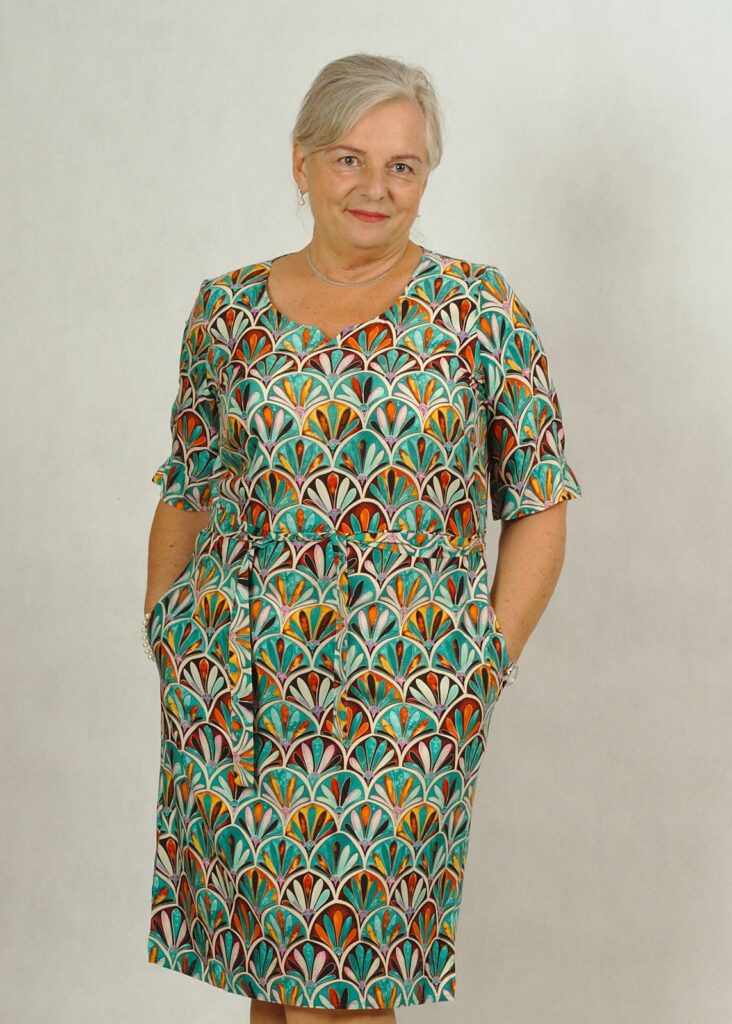 Elegancka sukienka z tkaniny wiskozowej 100% w oryginalny mozaikowy wzór.