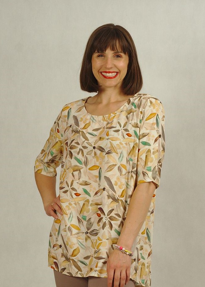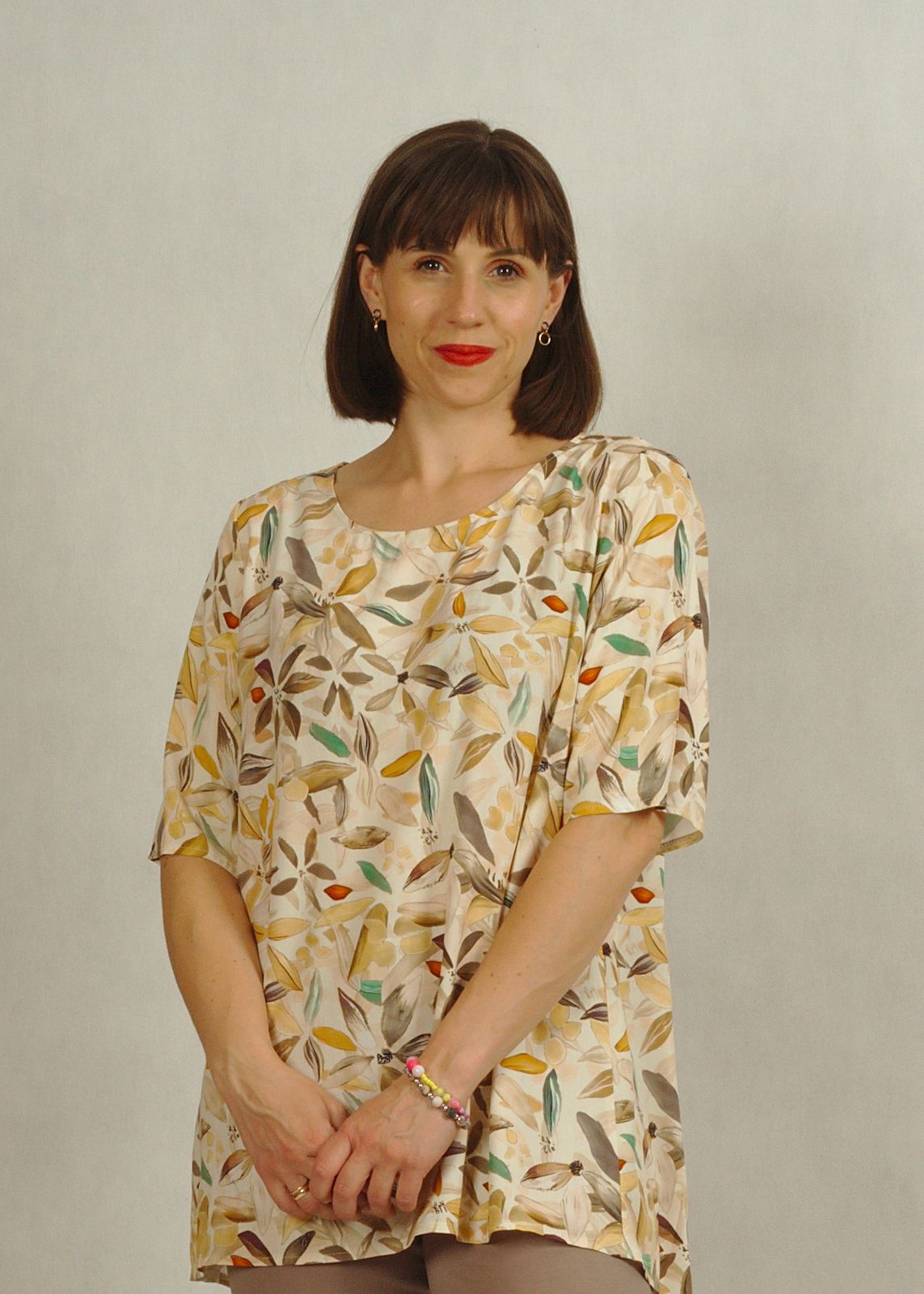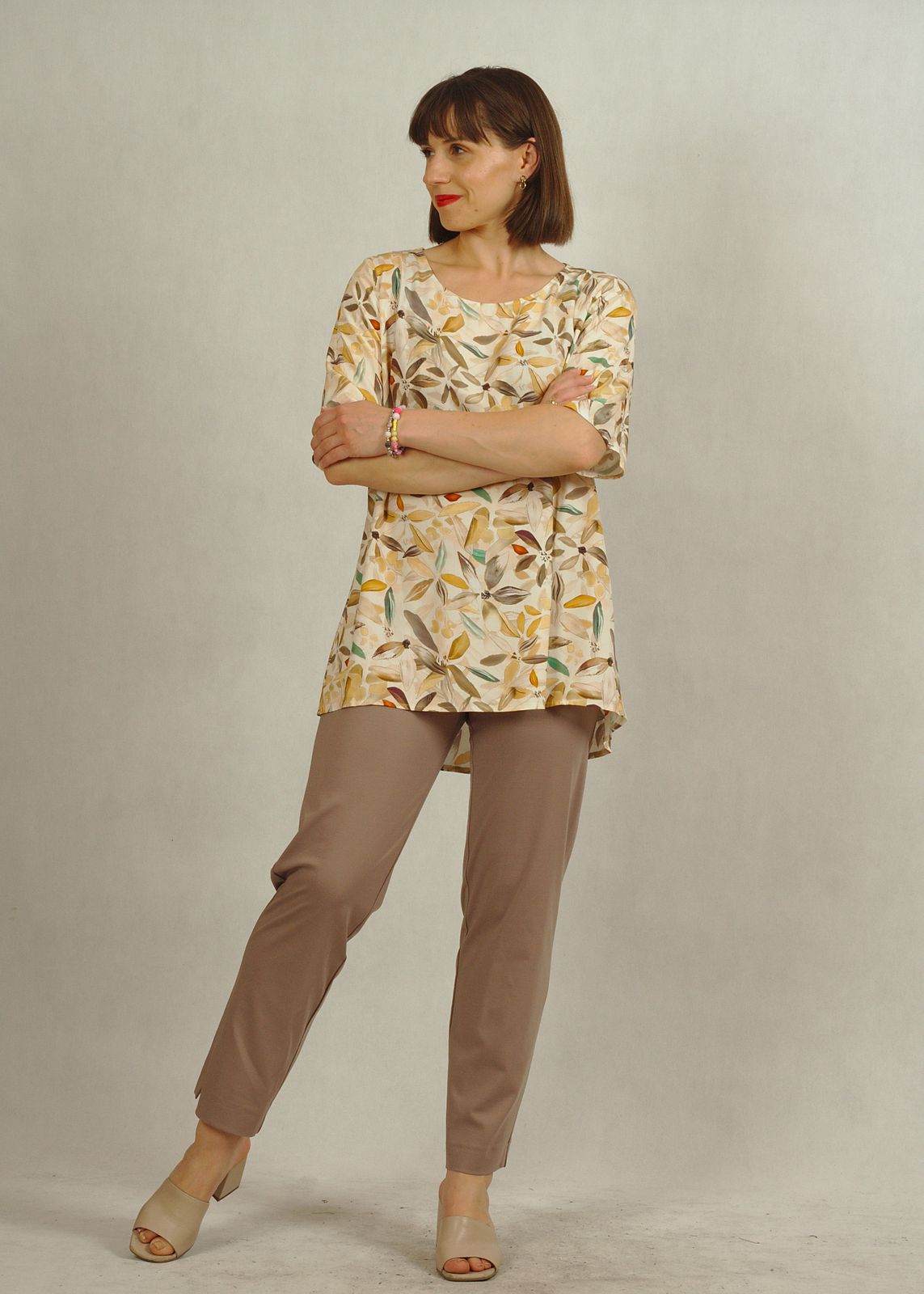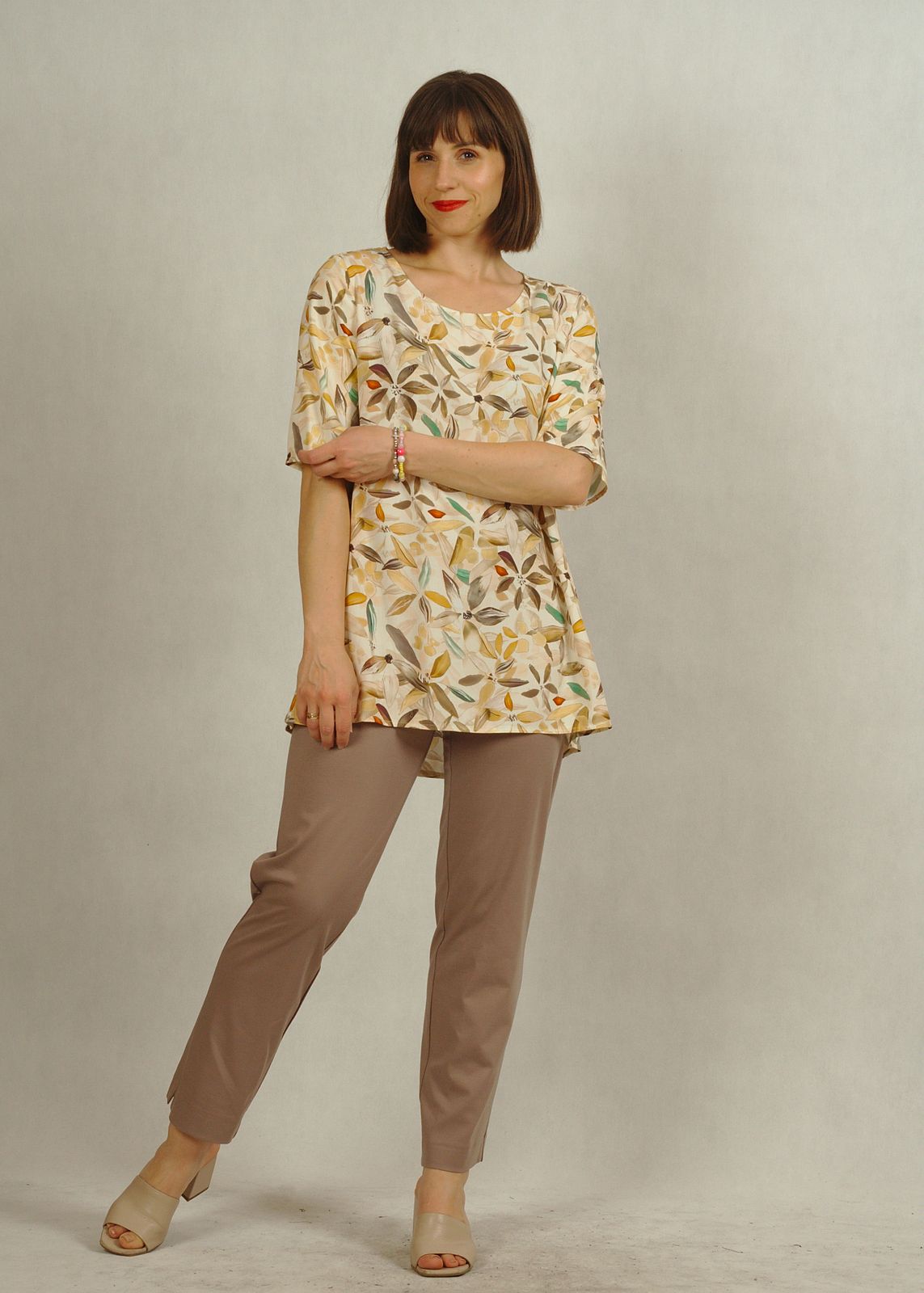 Krótki rękaw i jasna kolorystyka dodają bluzce świeżości, a subtelny wzór liści i kwiatów nadaje jej lekkości.