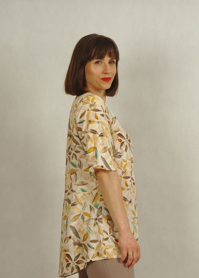 Bluzka posiada prosty krój z dłuższym tyłem, który elegancko opada na sylwetkę i sprawia, że model dobrze prezentuje się zarówno na luźno, jak i włożony do spodni czy spódnicy.