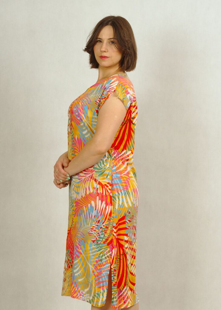 Sukienka ma prosty fason i długość delikatnie za kolano.