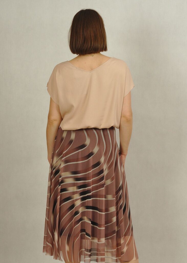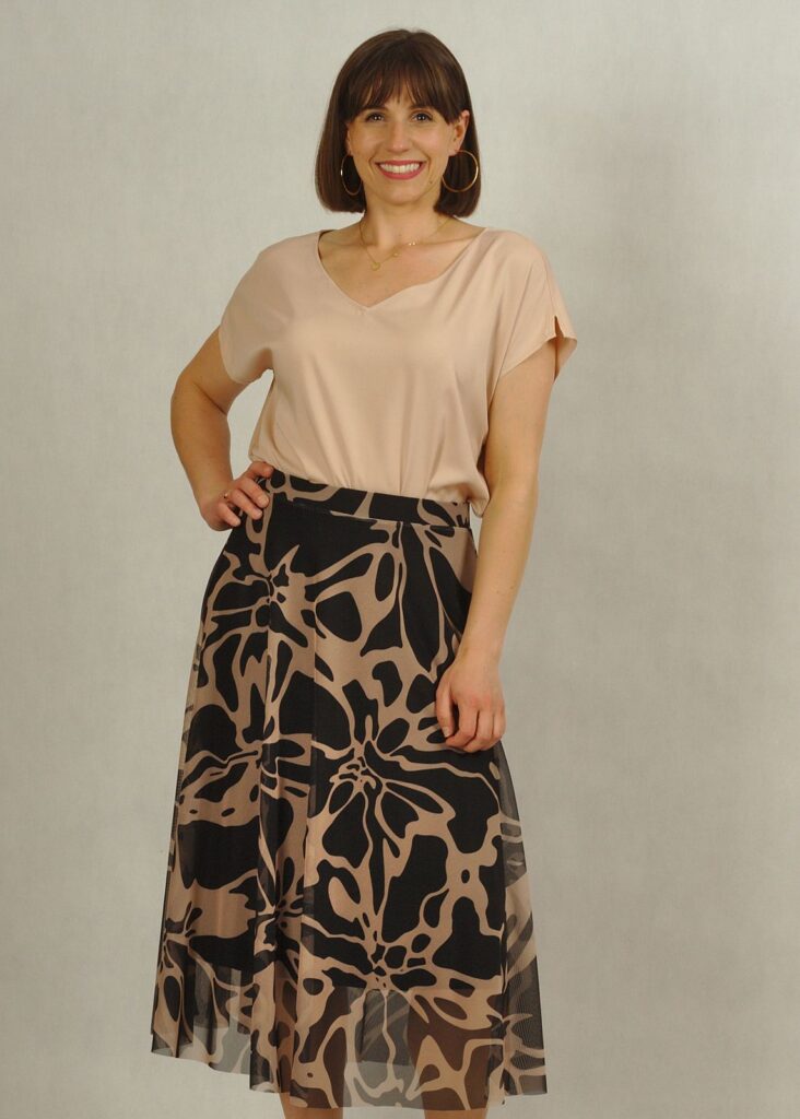 Bluzka ma piękny dekolt w serek, wysmuklający sylwetkę. Rękaw luźno opadający krótki, z drobnym rozcięciem na ramieniu.