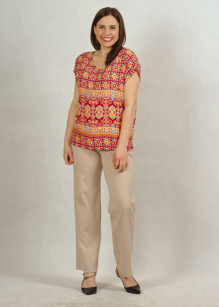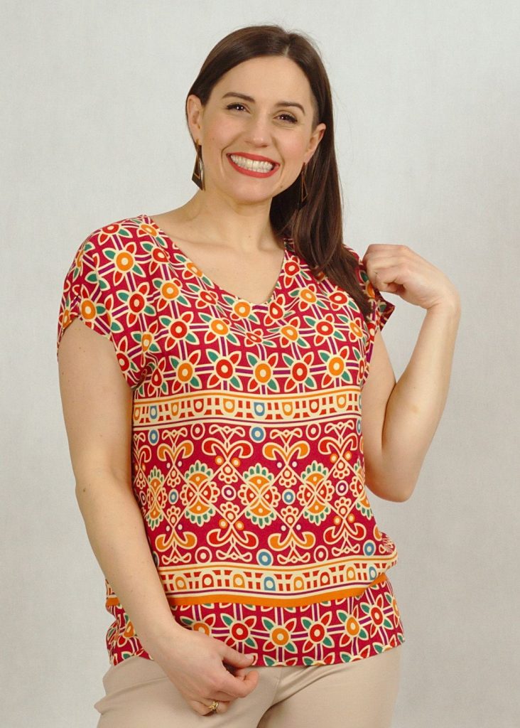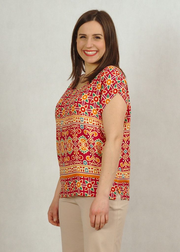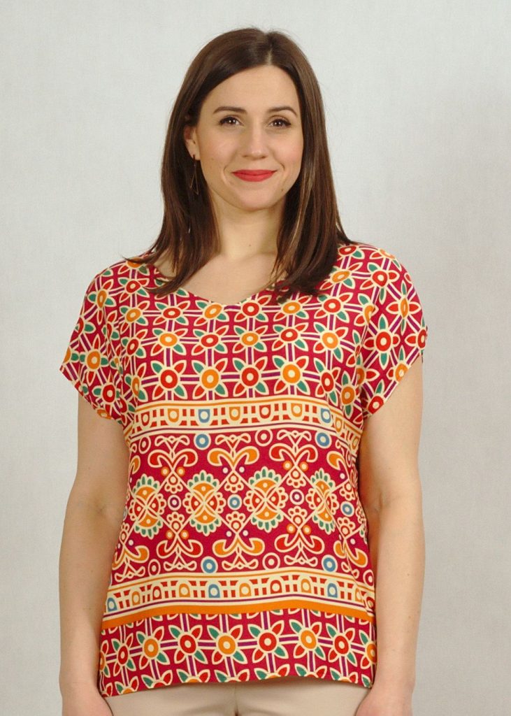 Bluzka ma piękny dekolt w serek, wysmuklający sylwetkę. Rękaw luźno opadający krótki typu kimono, z drobnym rozcięciem na ramieniu.
