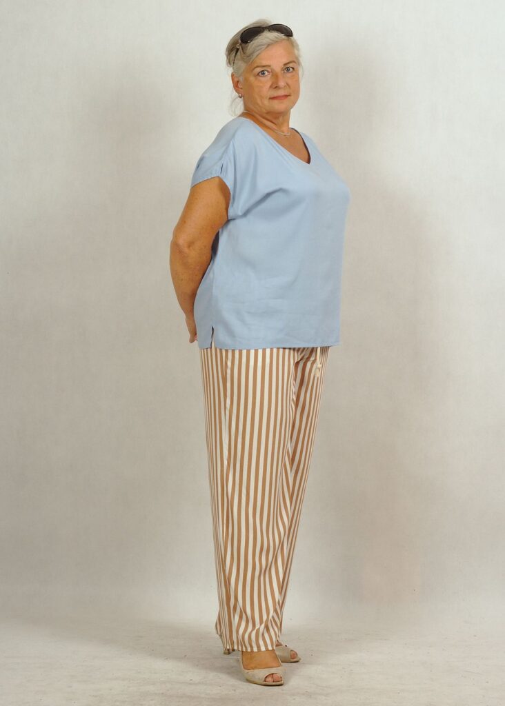Bluzka ma piękny dekolt w serek, wysmuklający sylwetkę. Rękaw luźno opadający krótki, z drobnym rozcięciem na ramieniu.