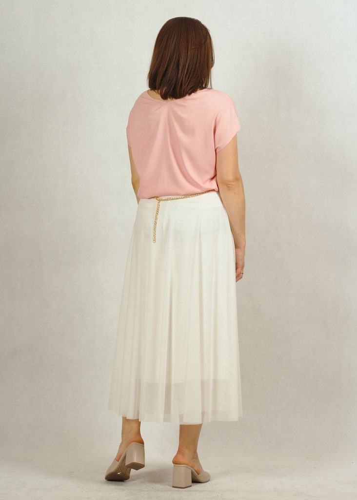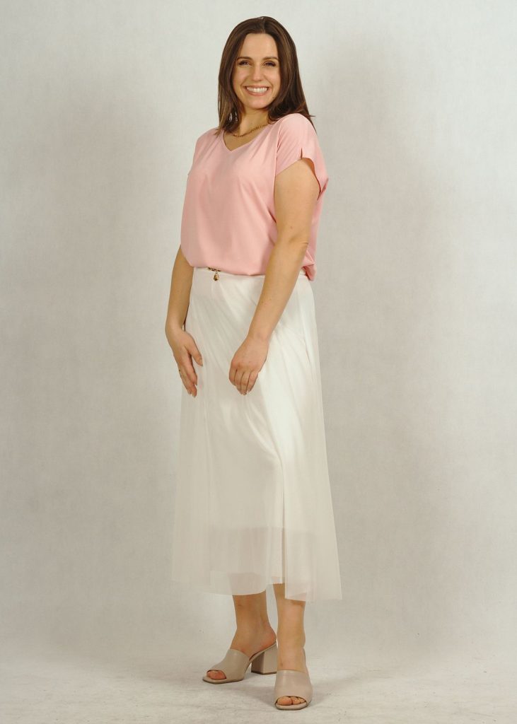 Bluzka ma piękny dekolt w serek, wysmuklający sylwetkę. Rękaw luźno opadający krótki, z drobnym rozcięciem na ramieniu.