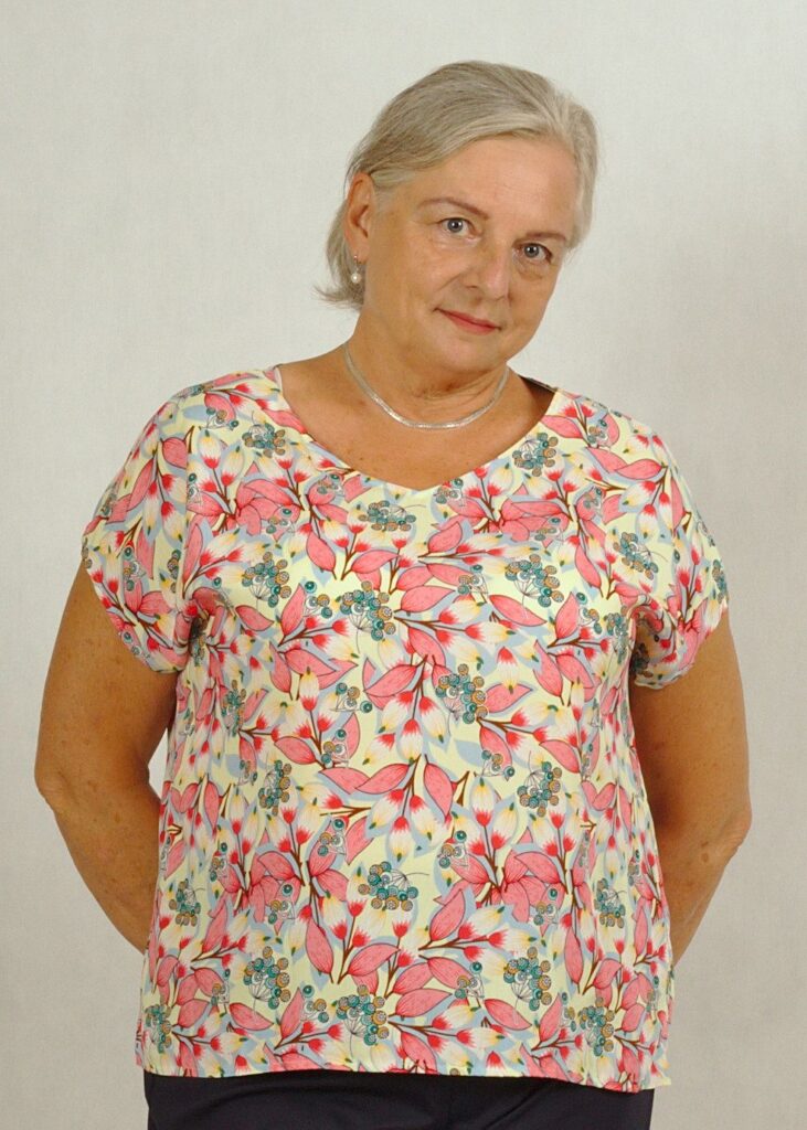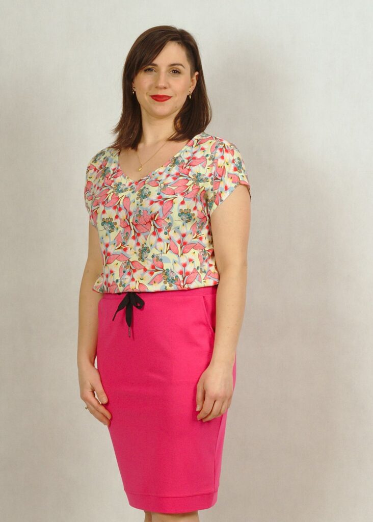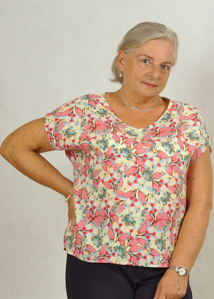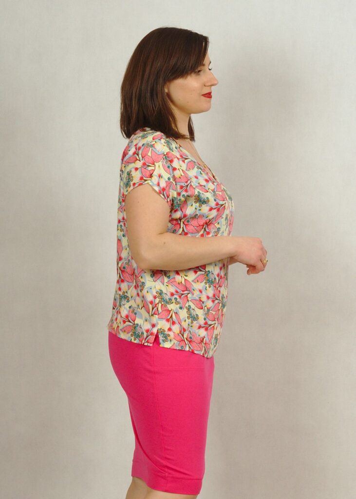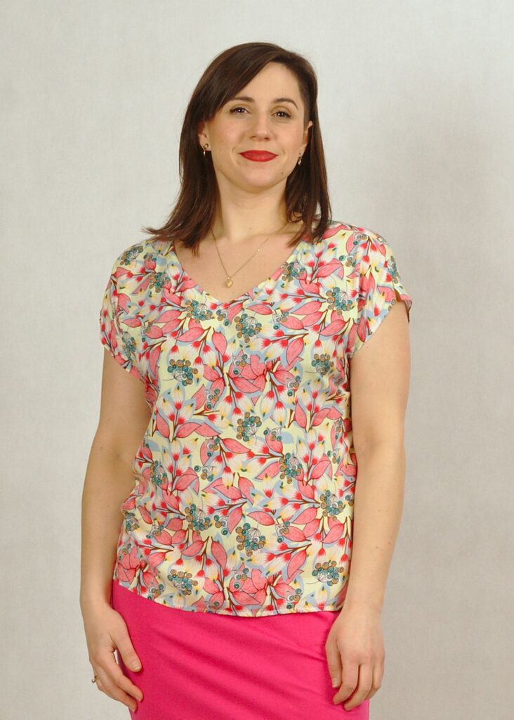 Bluzka ma piękny dekolt w serek, wysmuklający sylwetkę. Rękaw luźno opadający krótki typu kimono, z drobnym rozcięciem na ramieniu.
