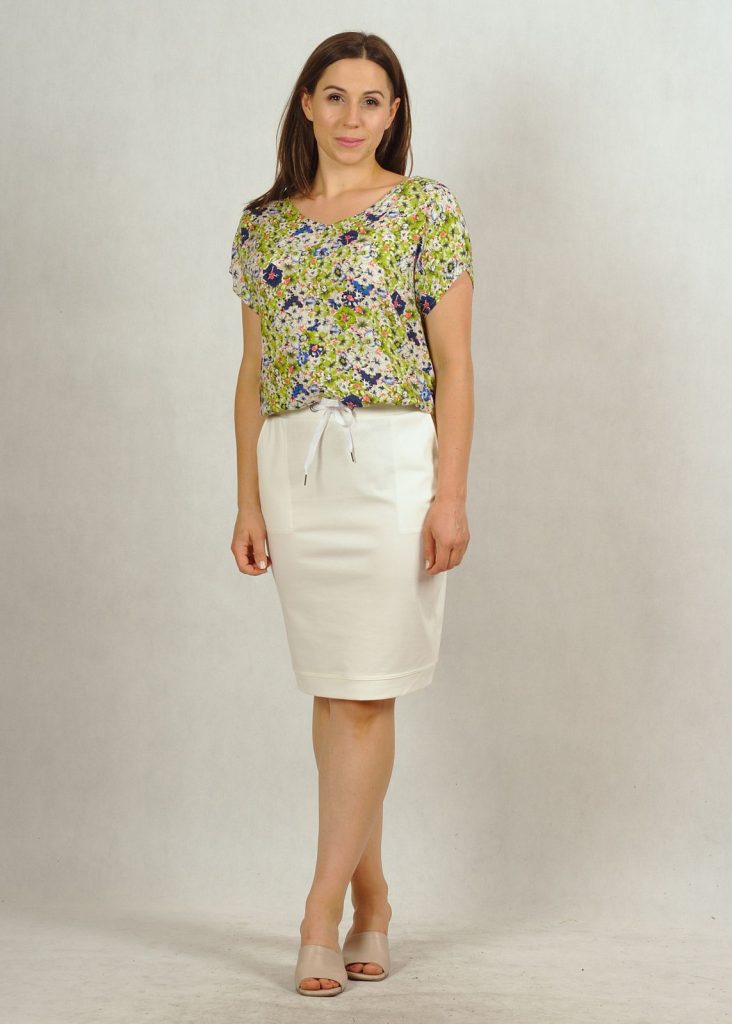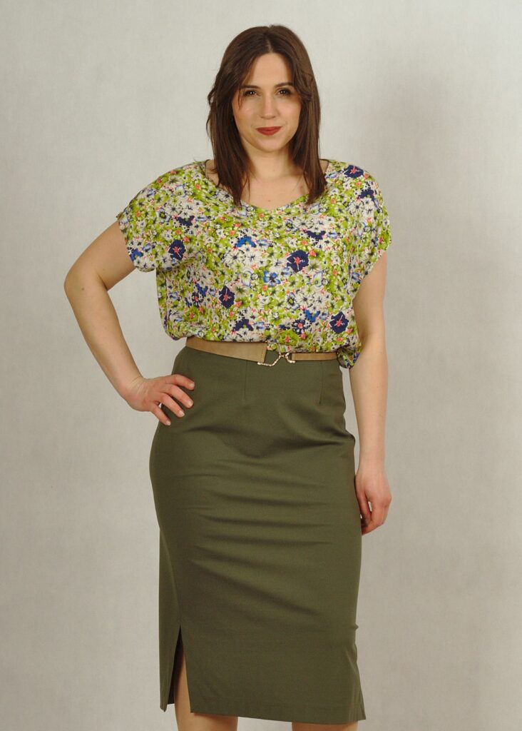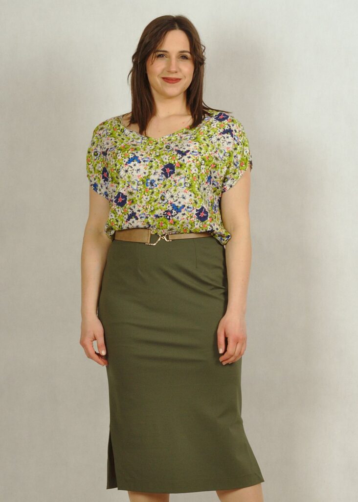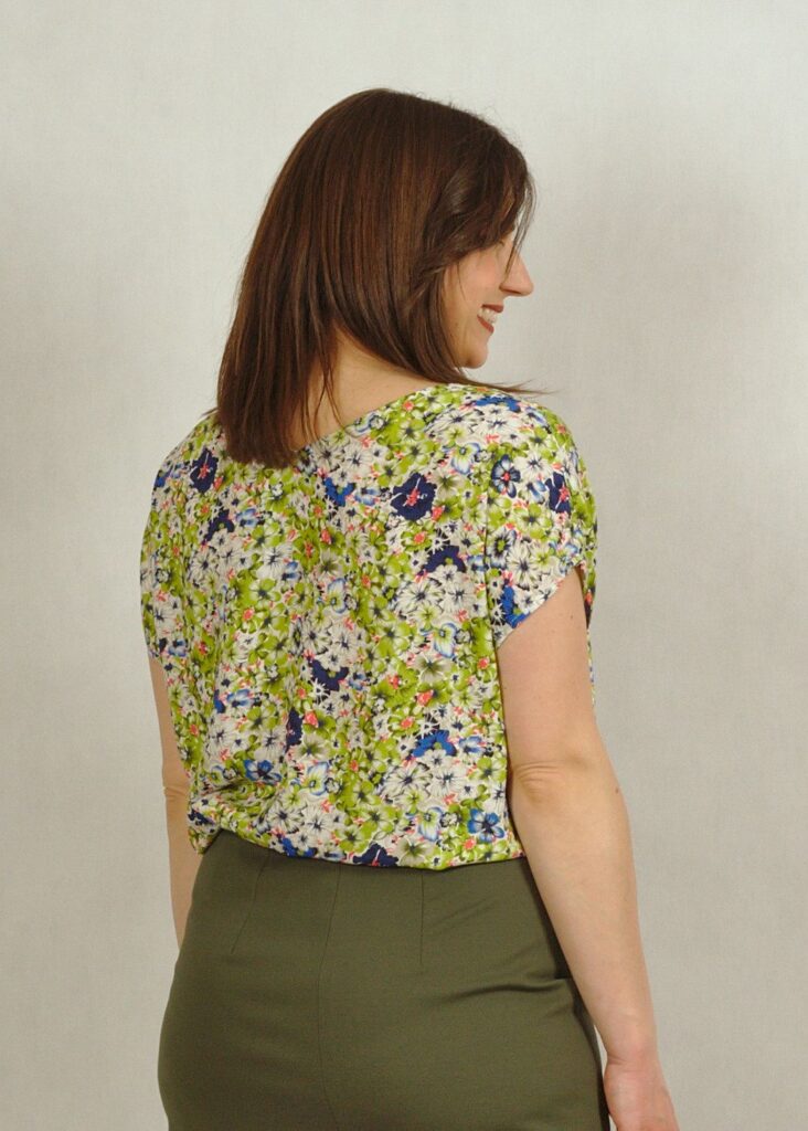 Bluzka ma piękny dekolt w serek, wysmuklający sylwetkę. Rękaw luźno opadający krótki typu kimono, z drobnym rozcięciem na ramieniu.