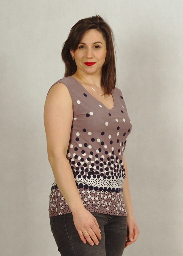 Bluzka jest ciemnobeżowa w piękne białe i czarne grochy.