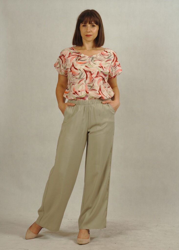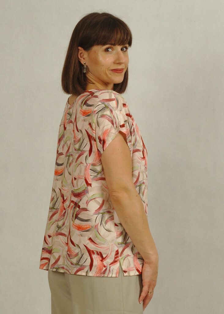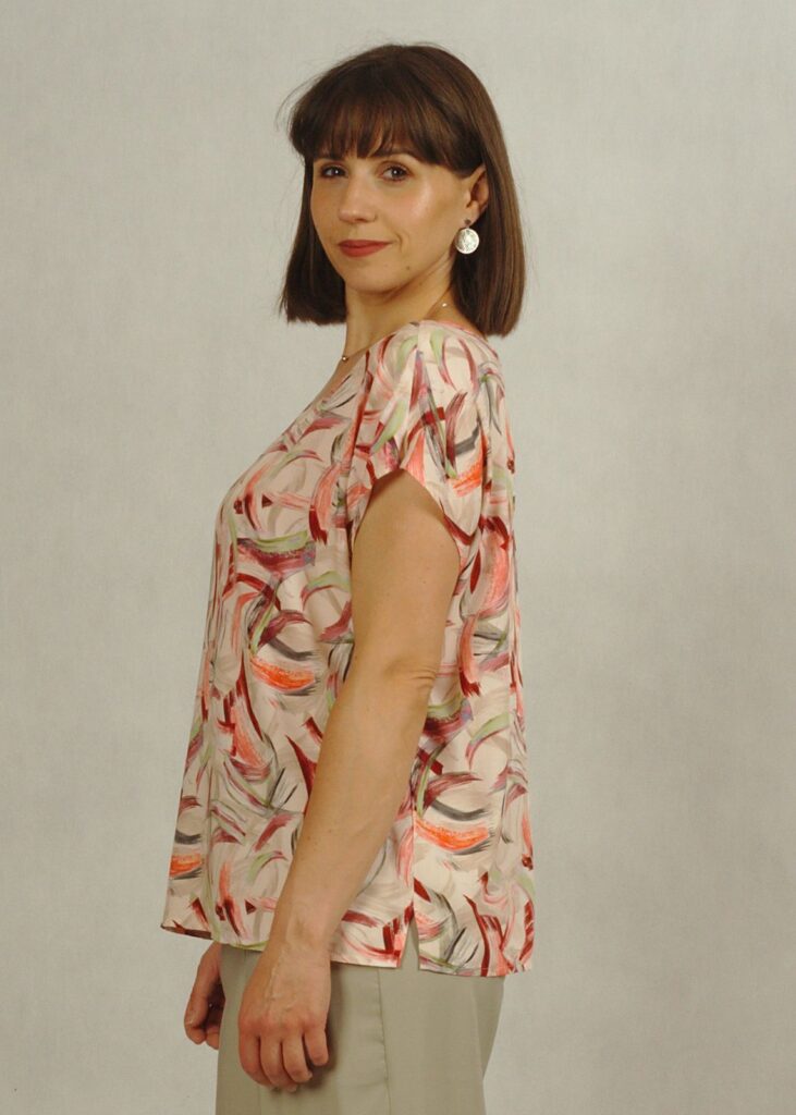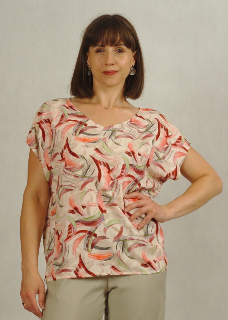 Wykonana z naturalnej, przewiewnej wiskozy, ta bluzka letnia łączy lekkość materiału z modnym wzornictwem.