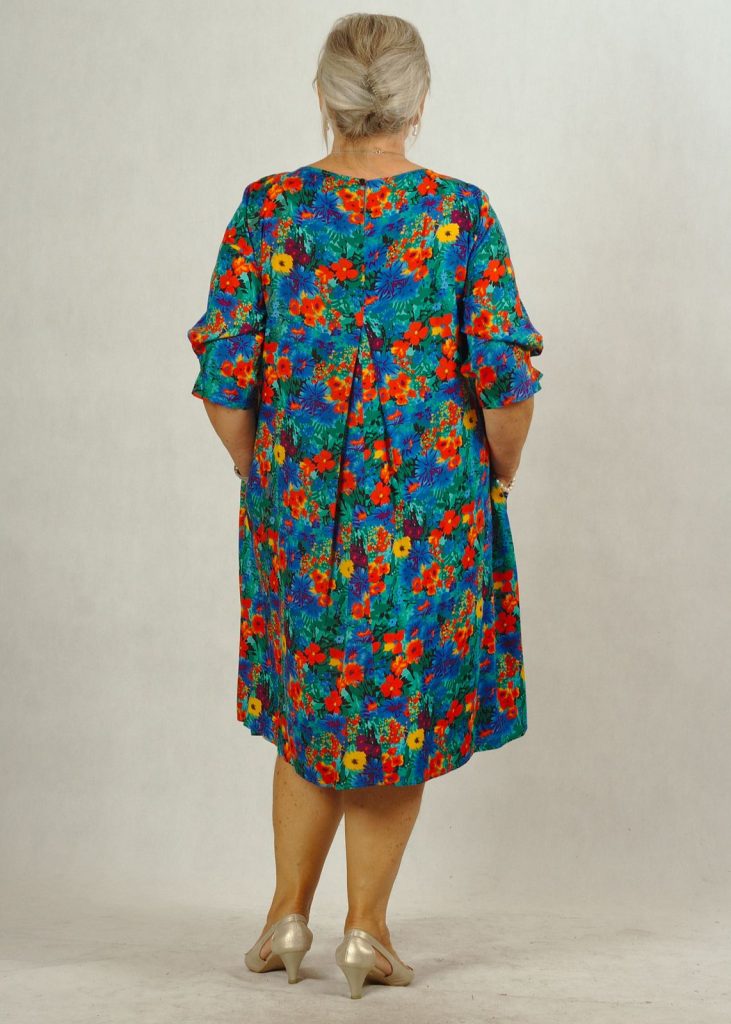 Poza niebanalnym kwiatowym wzorem, wzrok przyciągają śliczne detale, takie jak ciekawie wykończony rękaw, pasek oraz tył sukienki.