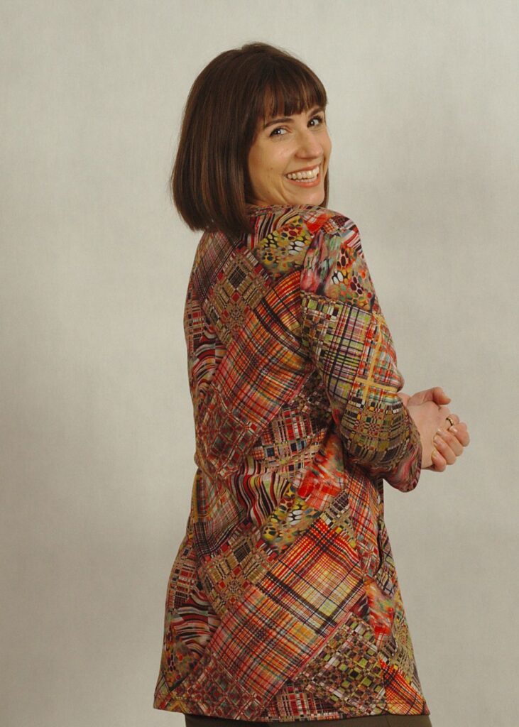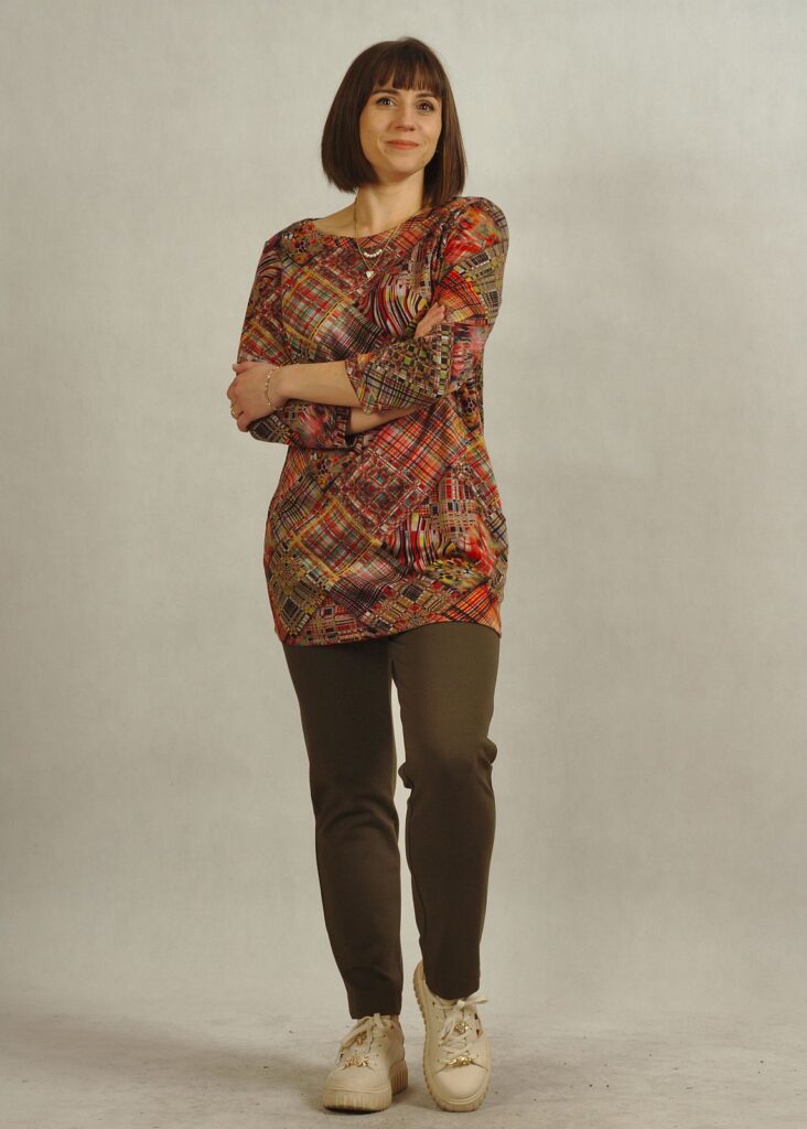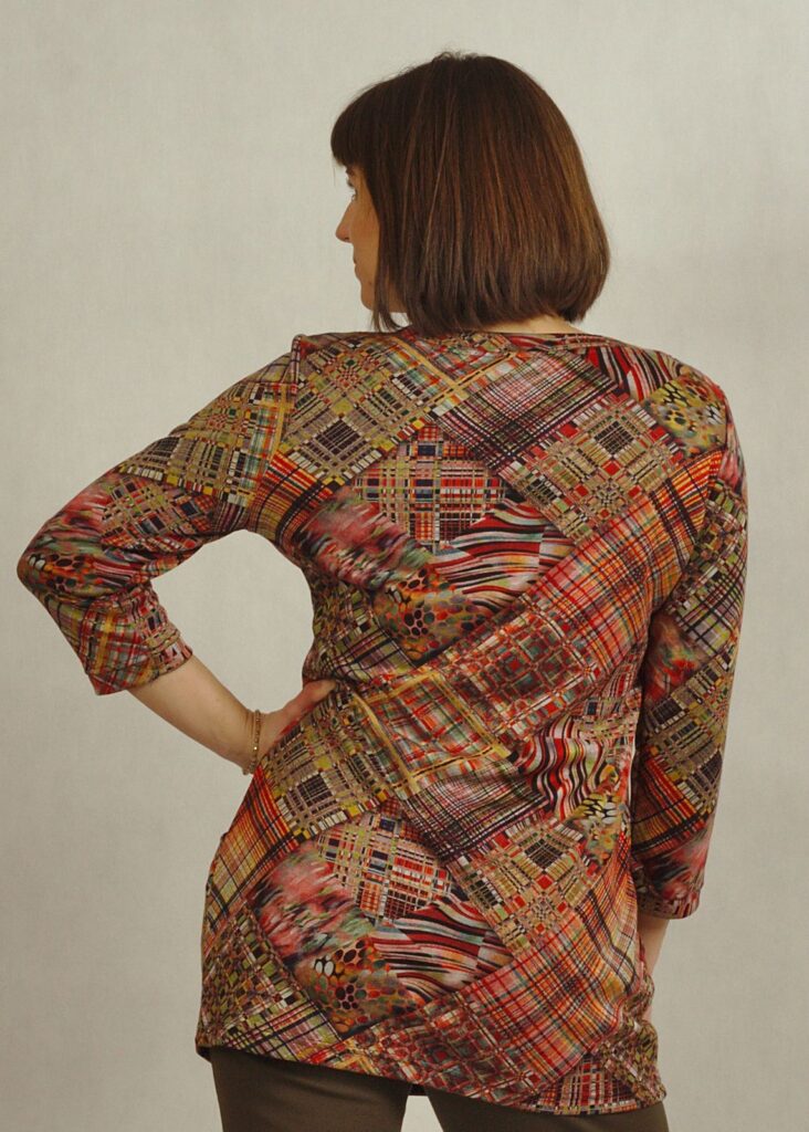 Tunika z dzianiny w kolorystyce czerwonej z delikatnym patchworkiem.