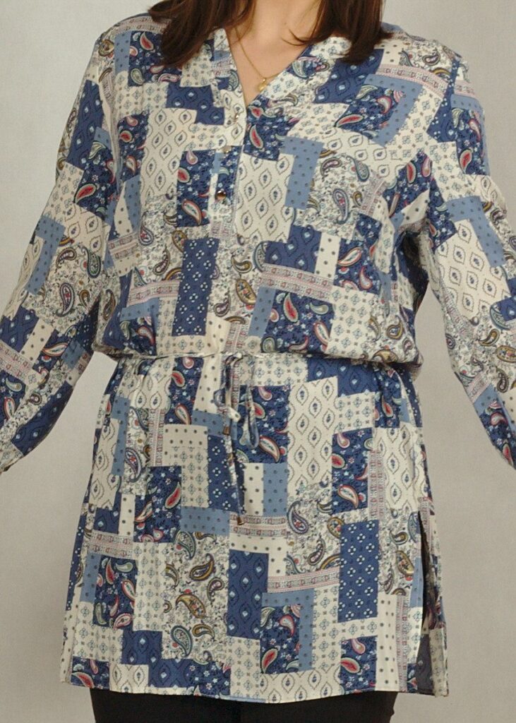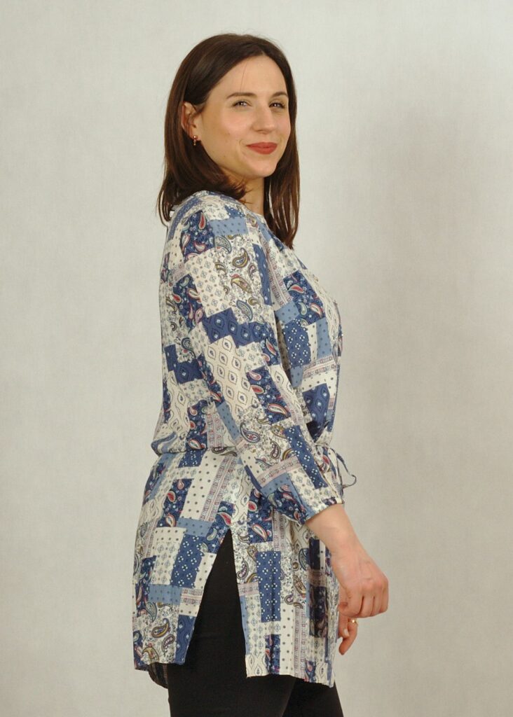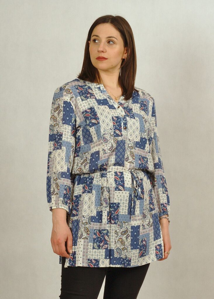Tunika wiązana w talii z rewersem na guziki patchwork niebieski /516/