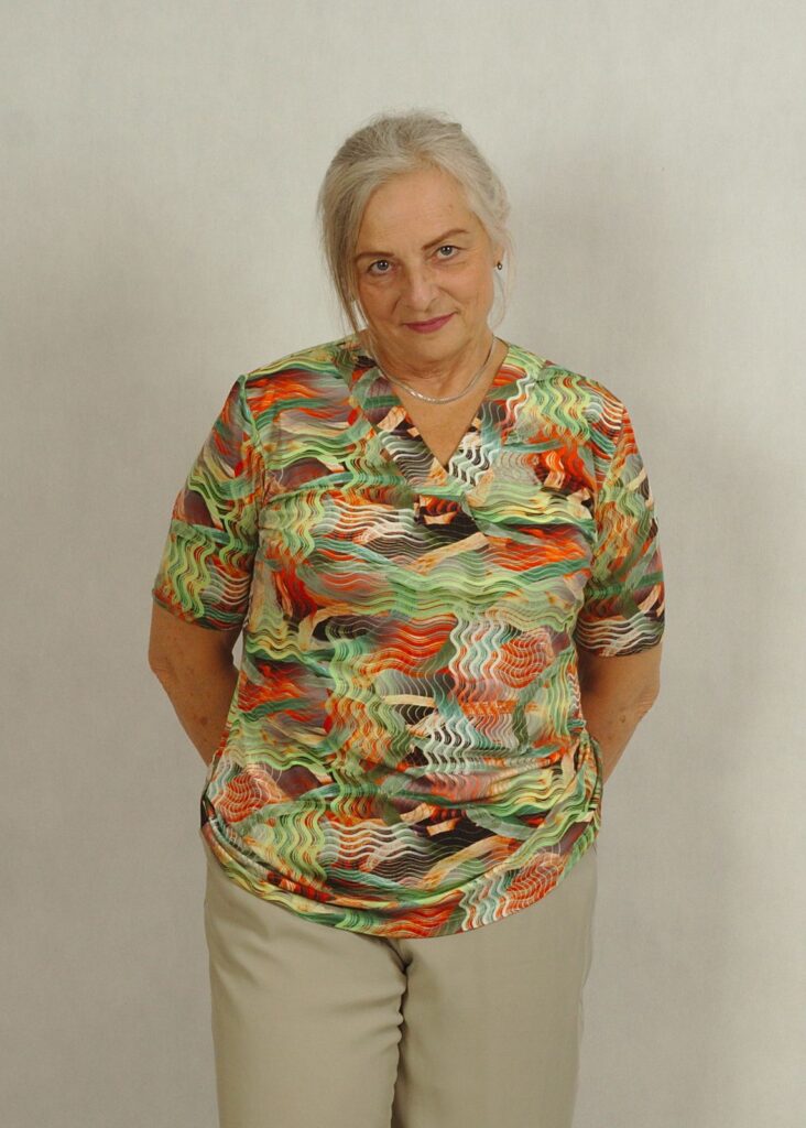 Tunika w serek optycznie wysmukla sylwetkę, a tunika z krótkim rękawem zapewnia swobodę ruchów w ciepłe dni.